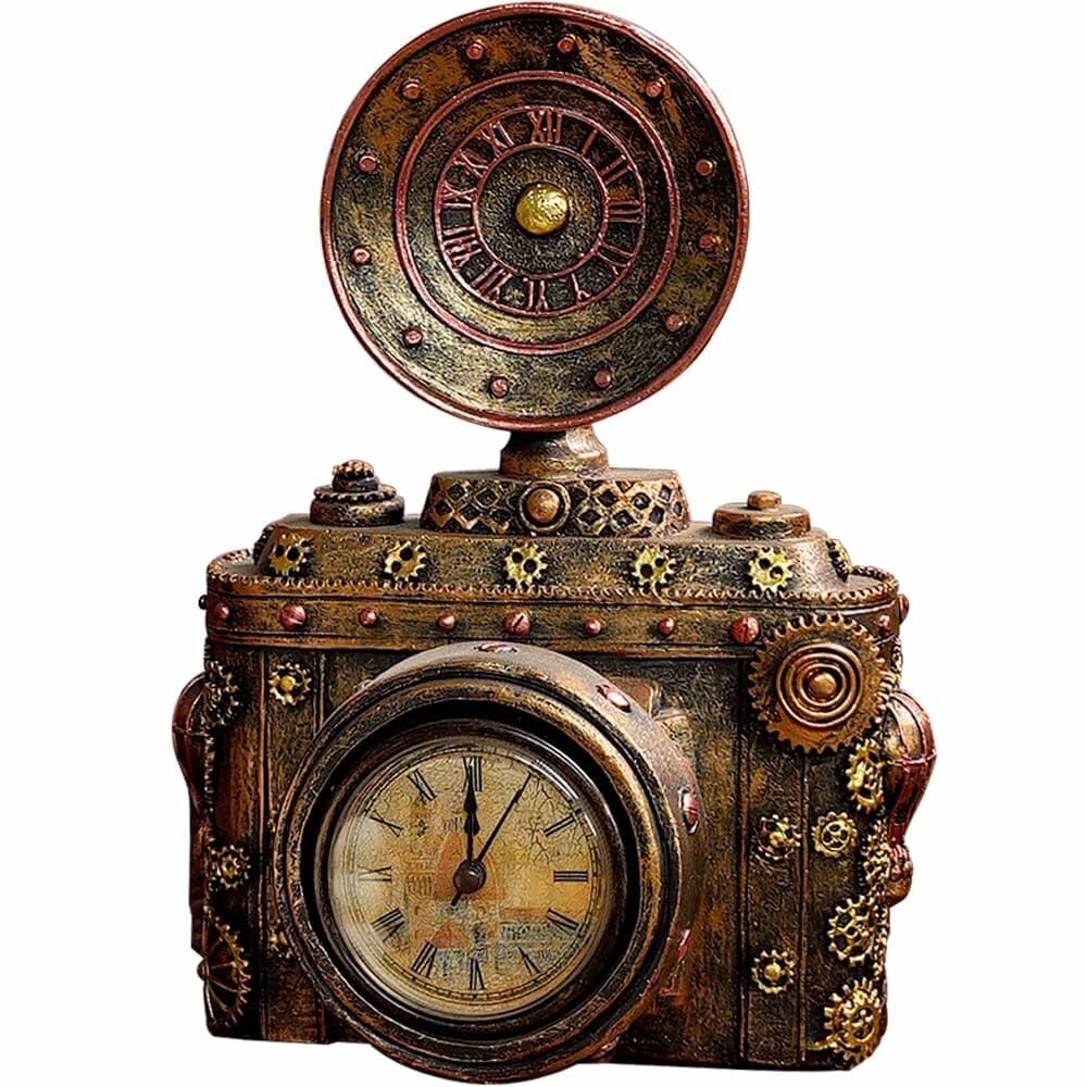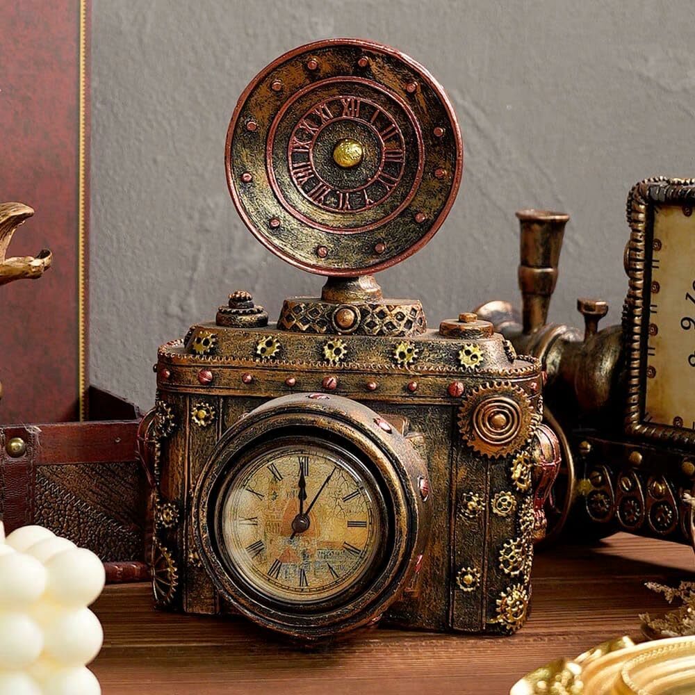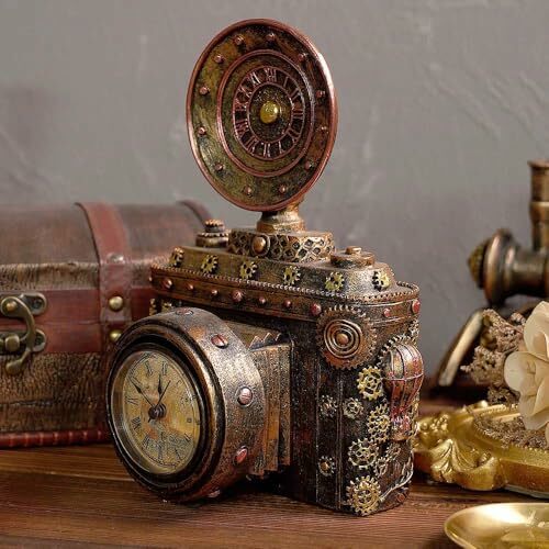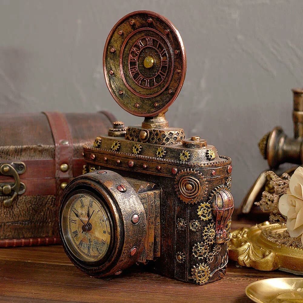 Transform your space with the charm of a bygone era using this Steampunk Vintage Camera Clock ? a perfect blend of antique elegance and industrial style. Expertly crafted to resemble a retro camera, this eye-catching tabletop clock features intricate gear detailing, Roman numerals, and a rustic bronze-gold finish that screams vintage sophistication. Whether you're a photography lover, a steampunk enthusiast, or simply someone who appreciates unique home decor, this piece is a conversation starter! Ideal for placing on shelves, desks, side tables, or mantelpieces, it elevates the ambiance of any living room, office, study, or bedroom. ?? Product Highlights: Unique camera-shaped design with functional analog clock Durable resin construction with antique bronze copper finish Roman numeral dial with vintage-style world map backdrop Decorated with realistic industrial gears and rivets Size: Approx. 22.5x16x10.5 cm
