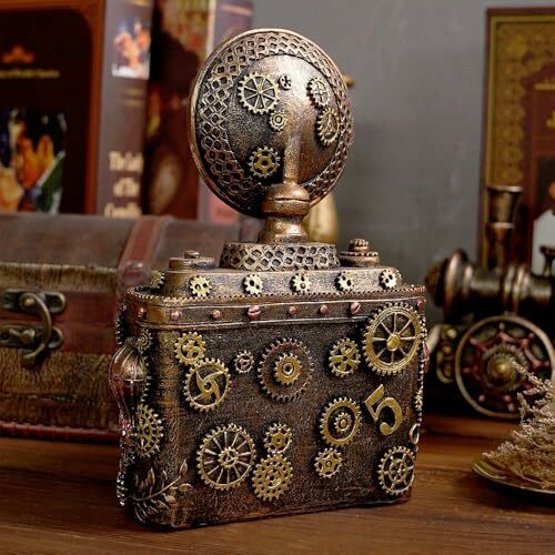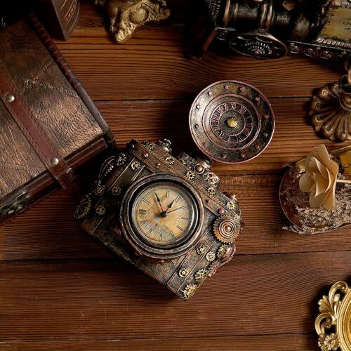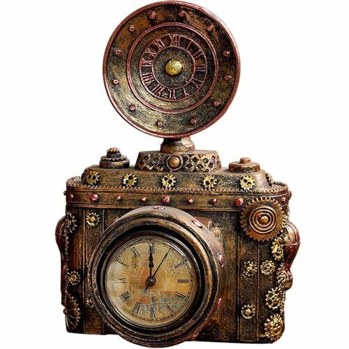 Product description: Transform your space with the charm of a bygone era using this Steampunk Vintage Camera Clock ? a perfect blend of antique elegance and industrial style. Expertly crafted to resemble a retro camera, this eye-catching tabletop clock features intricate gear detailing, Roman numerals, and a rustic bronze-gold finish that screams vintage sophistication. Whether you're a photography lover, a steampunk enthusiast, or simply someone who appreciates unique home decor, this piece is a conversation starter! Ideal for placing on shelves, desks, side tables, or mantelpieces, it elevates the ambiance of any living room, office, study, or bedroom. ?? Product Highlights: Unique camera-shaped design with functional analog clock Durable resin construction with antique bronze copper finish Roman numeral dial with vintage-style world map backdrop Decorated with realistic industrial gears and rivets Size: Approx. 22.5x16x10.5 cm