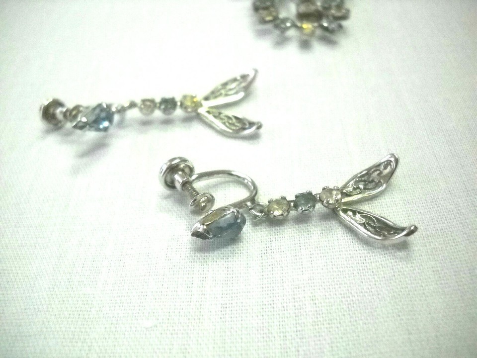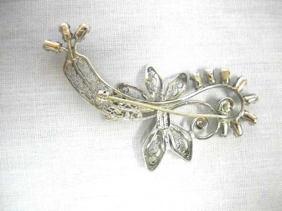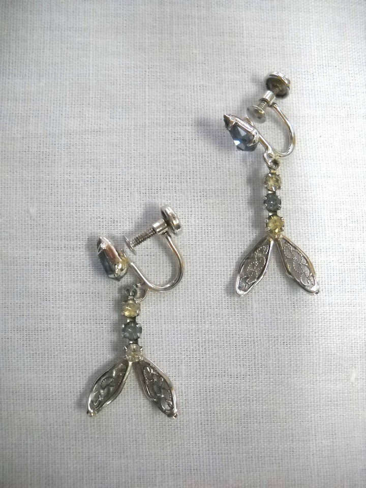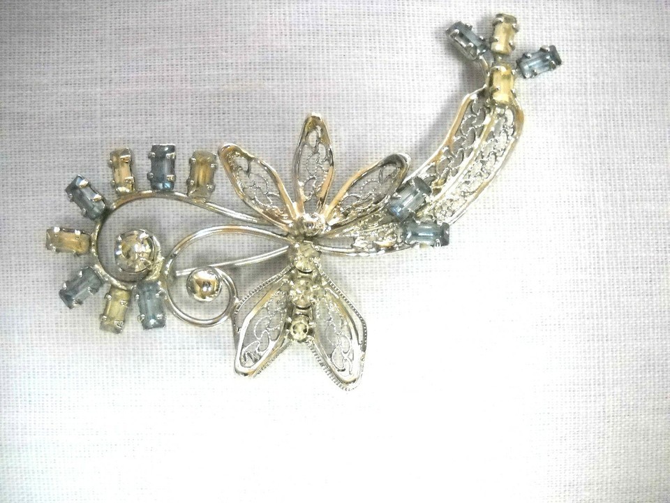 - STERLING BROOCH PIN & EARRINGS w BABY BLUE & WHITE RHINESTONES UNIQUE ART DECO