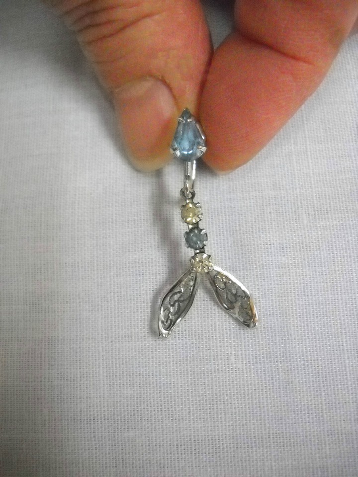 STERLING BROOCH PIN & EARRINGS w BABY BLUE & WHITE RHINESTONES UNIQUE ART DECO