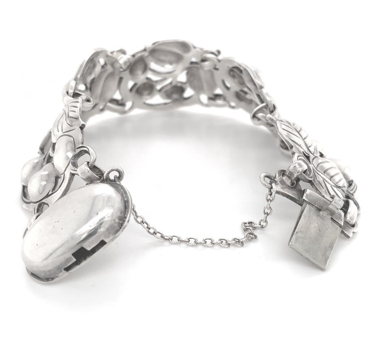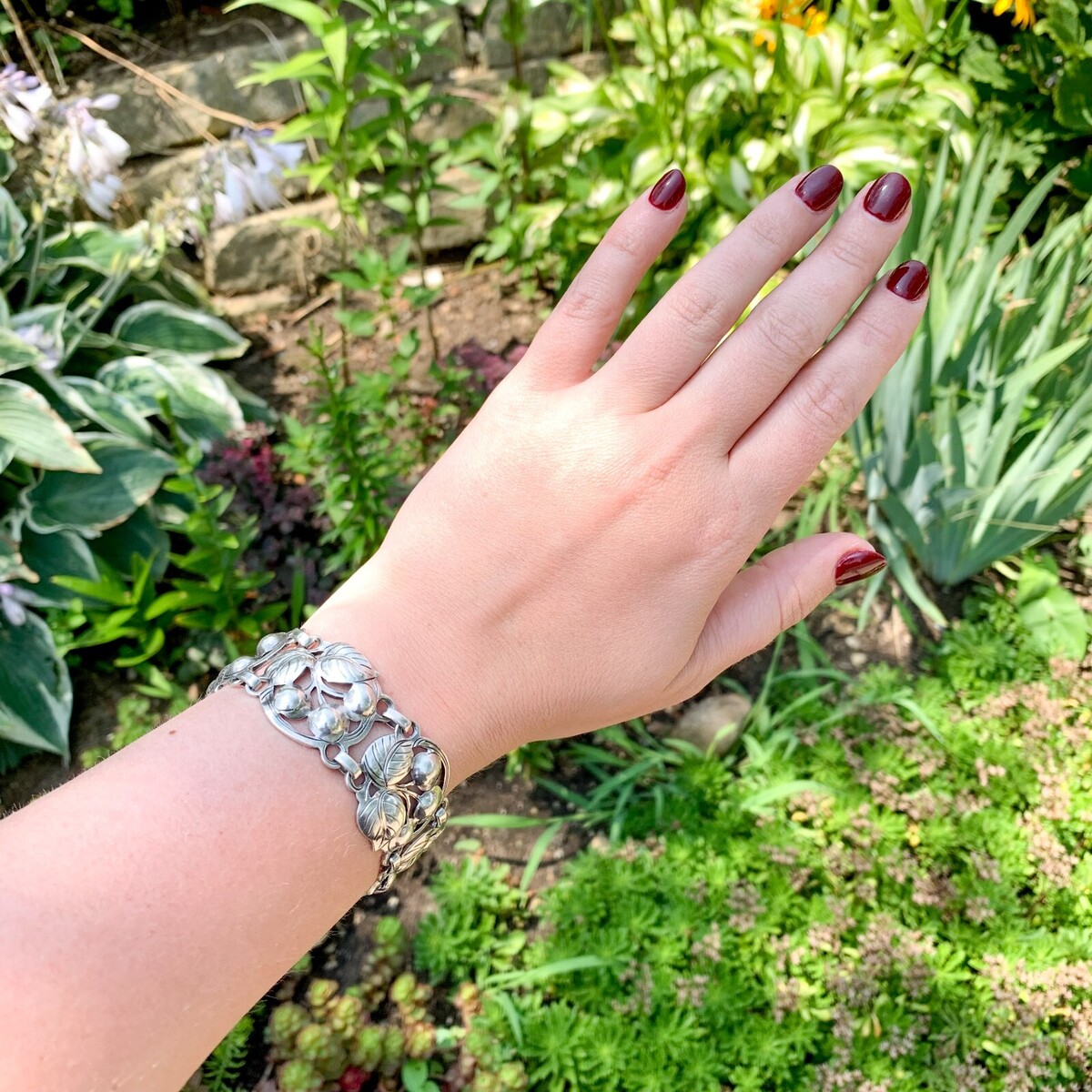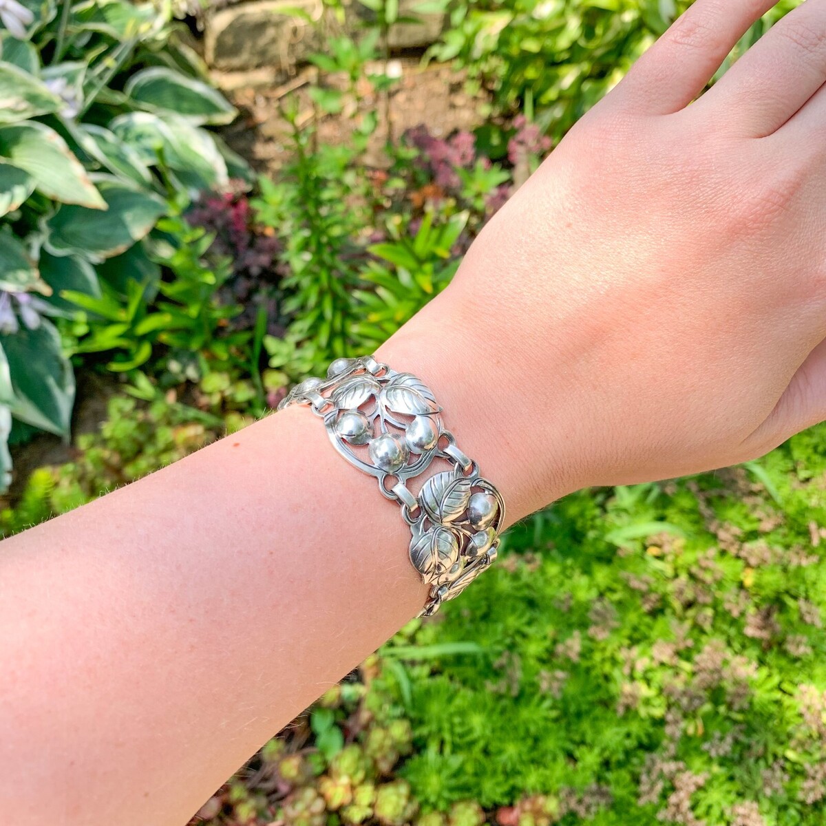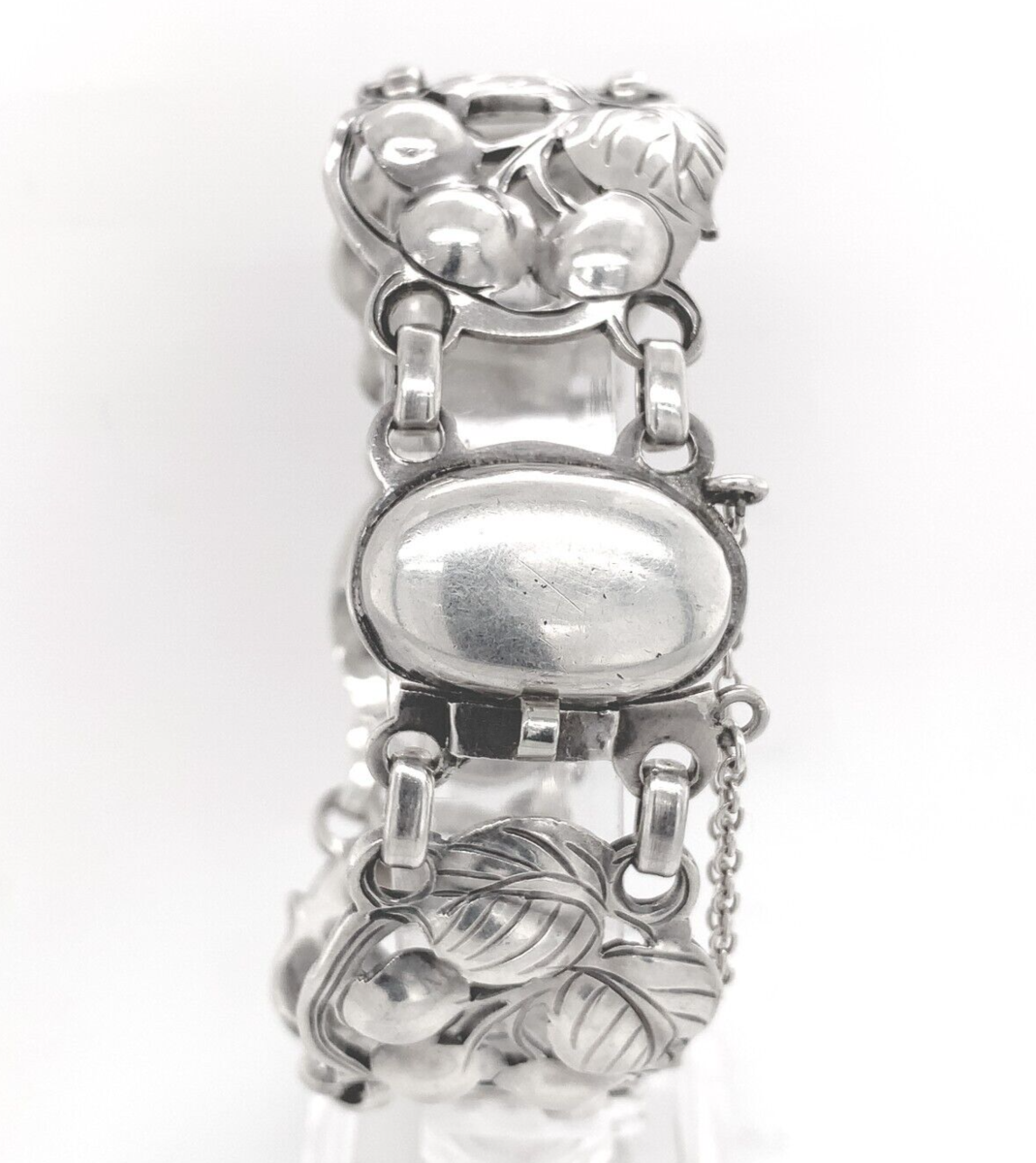 Sterling handwrought bracelet made by Bjarne Axness, employee at the Kalo silver shop in Illinois. Marked: Sterling. The bracelet features three pierced and engraved panels, each with three cherries and two leaves and a plain polished oval clasp with safety chain. The bracelet measures a little over 1" wide and 7" long and weighs 32.82 dwt. Circa 1909-1940s. Purchased from Bjarne's grandson. Fabulous!