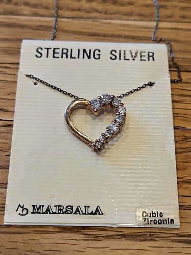 Vintage Sterling Silver/Cubic Zirconia Heart/Half Gem Design w/17'' Chain Necklace