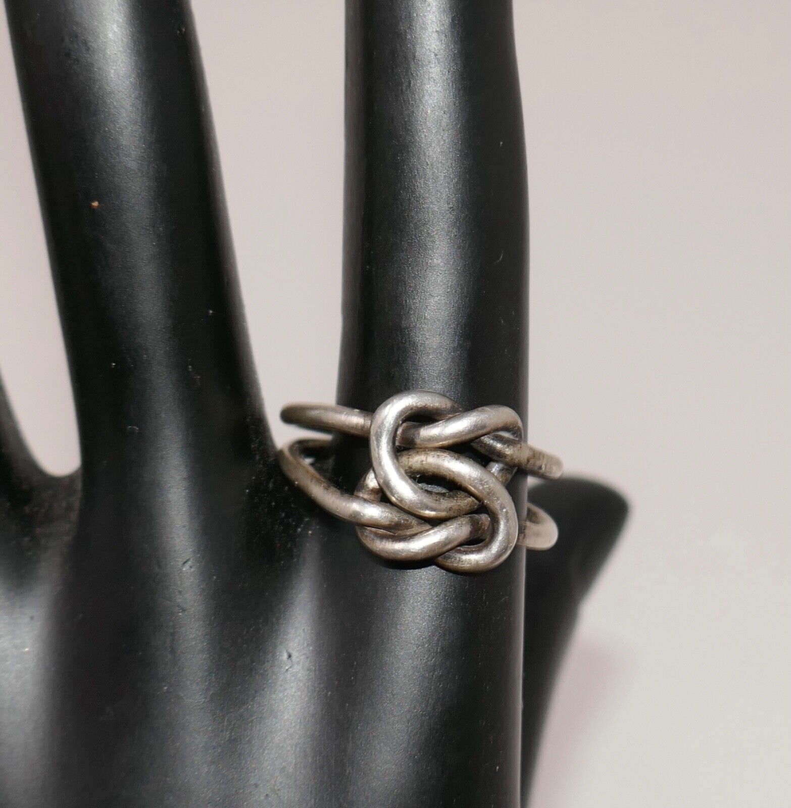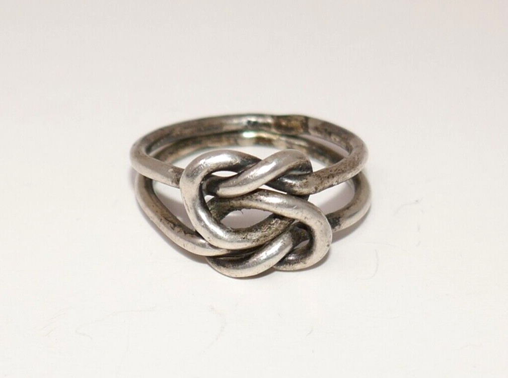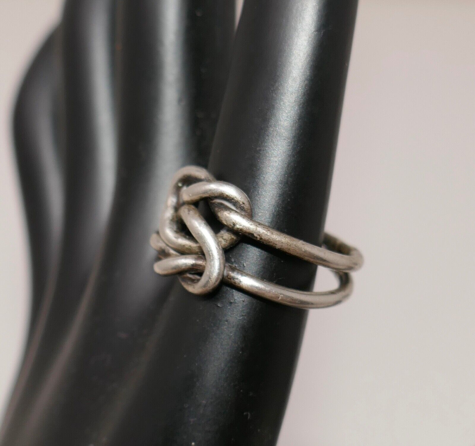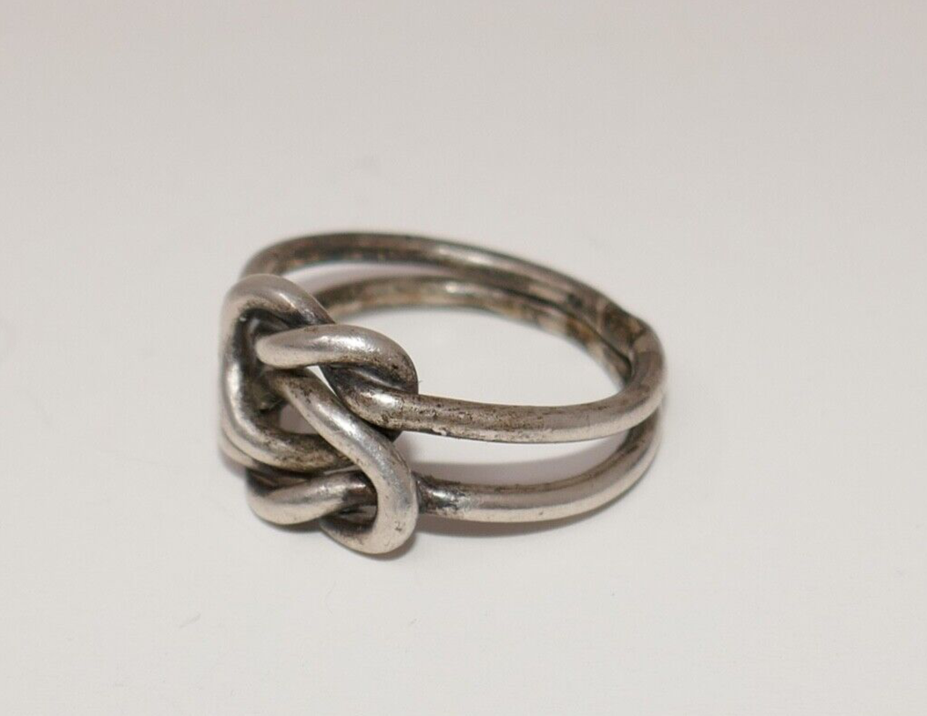 This Sterling Silver Double Love Knot Ring is a unique piece of fine jewelry that will add elegance to any outfit. The ring is intricately crafted with a knot design, giving it a vintage charm. The ring has a band width of 3.6 mm and is made of sterling silver, though the metal purity is unknown. This ring is perfect for those who appreciate the simple things in life and want to add a touch of love to their style. Weighs 4.9 grams with some patina and wear. See photos for item condition, this is a picture of the actual item. All reasonable offers considered!! **Payment** We do expect payment within 48 hours of the purchase. If for some reason you need a couple of extra days, please let us know. **Feedback** Once you have received your item, if you are satisfied, please leave feedback. We are happy to leave feedback for you after you have left feedback for us to let us know that you have received your item and the transaction is complete. Please contact us before leaving feedback if there is a problem. **International Buyers ? Please Note** Import duties, taxes, and charges are not included in the item price or shipping cost. These charges are the buyer's responsibility. Please check with your country's customs office to determine what these additional costs will be prior to bidding or buying. Check out our store for more deals!!