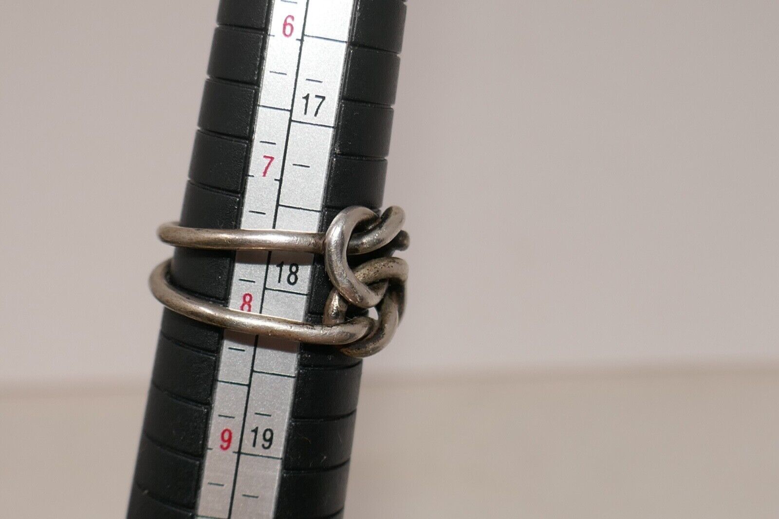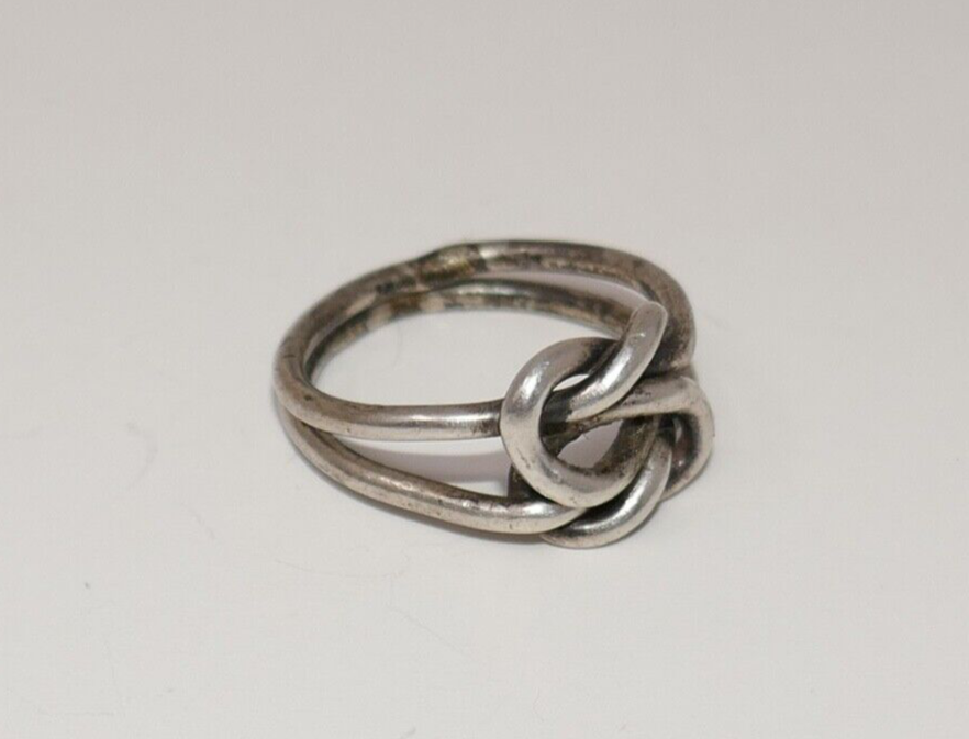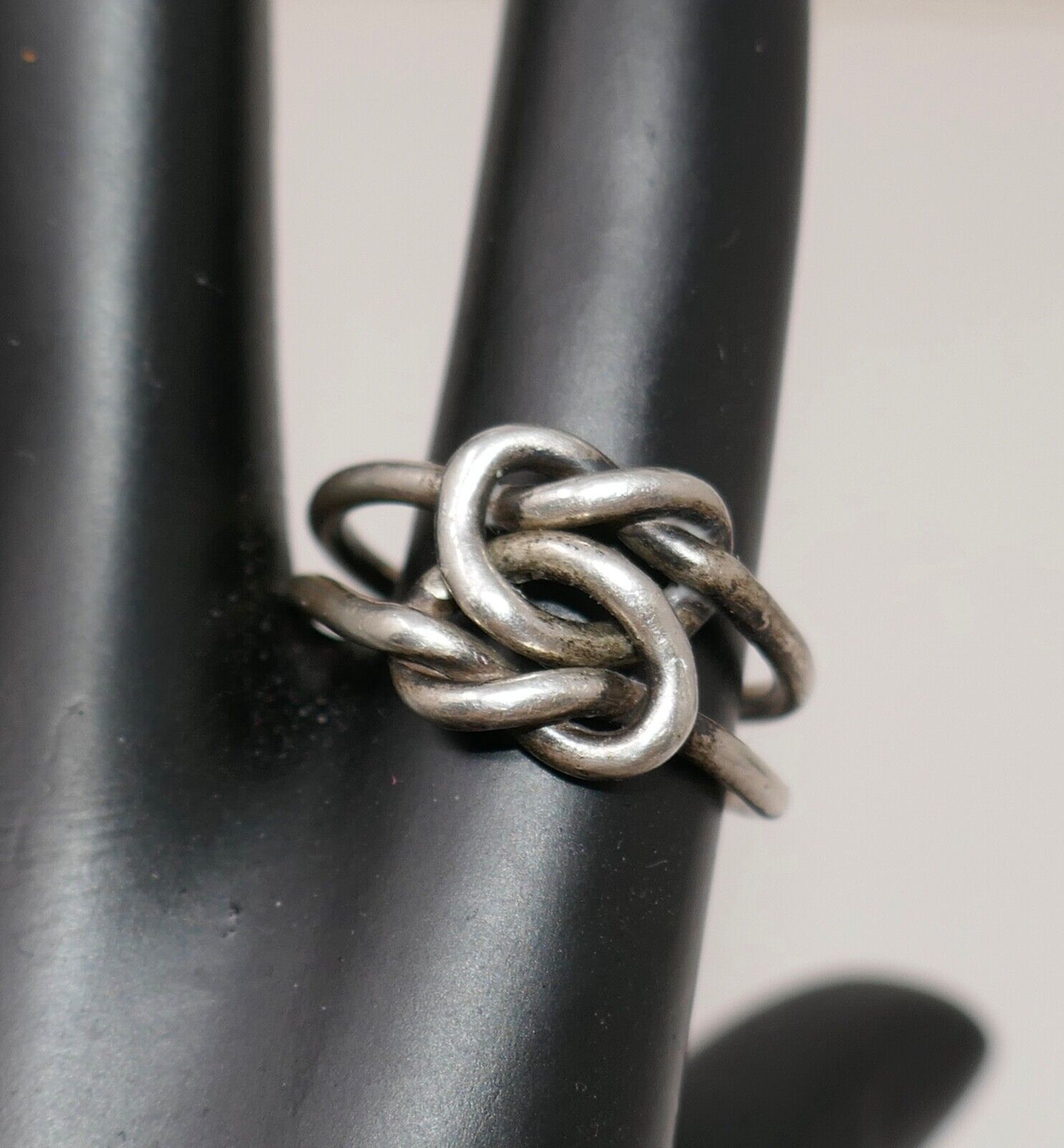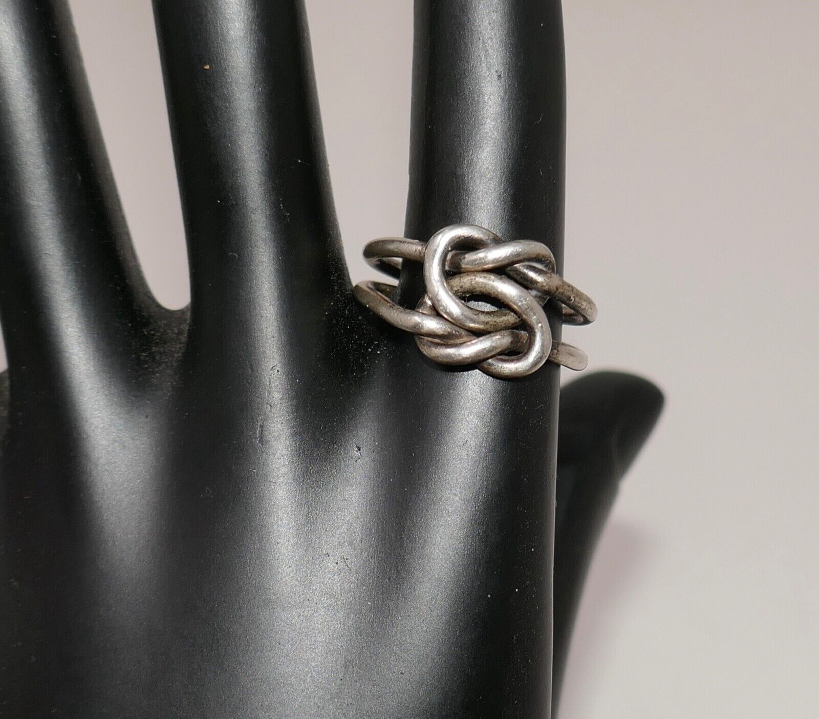 This Sterling Silver Double Love Knot Ring is a unique piece of fine jewelry that will add elegance to any outfit. The ring is intricately crafted with a knot design, giving it a vintage charm. The ring has a band width of 3.6 mm and is made of sterling silver, though the metal purity is unknown. This ring is perfect for those who appreciate the simple things in life and want to add a touch of love to their style. Weighs 4.9 grams with some patina and wear. See photos for item condition, this is a picture of the actual item. All reasonable offers considered!! **Payment** We do expect payment within 48 hours of the purchase. If for some reason you need a couple of extra days, please let us know. **Feedback** Once you have received your item, if you are satisfied, please leave feedback. We are happy to leave feedback for you after you have left feedback for us to let us know that you have received your item and the transaction is complete. Please contact us before leaving feedback if there is a problem. **International Buyers ? Please Note** Import duties, taxes, and charges are not included in the item price or shipping cost. These charges are the buyer's responsibility. Please check with your country's customs office to determine what these additional costs will be prior to bidding or buying. Check out our store for more deals!!