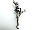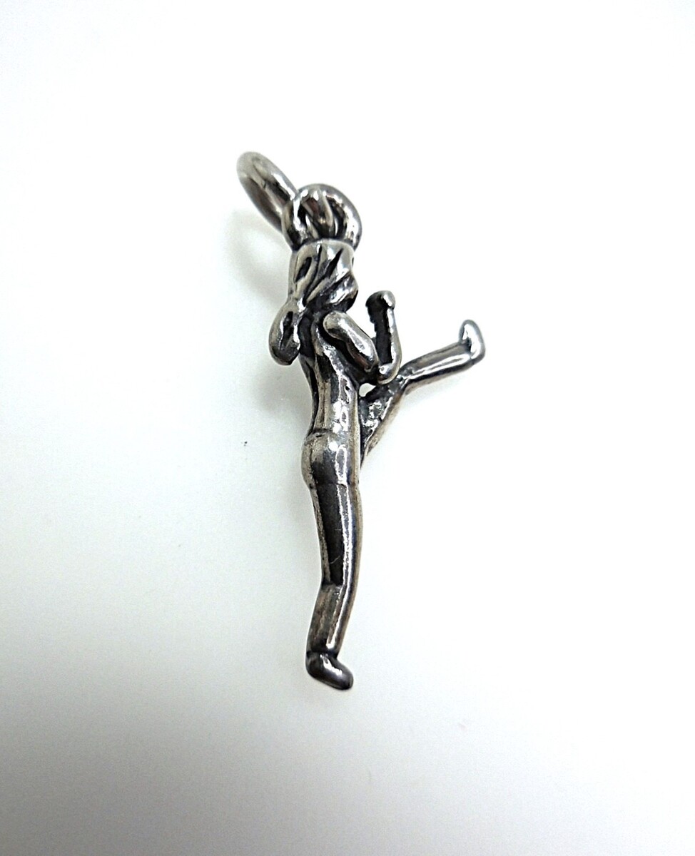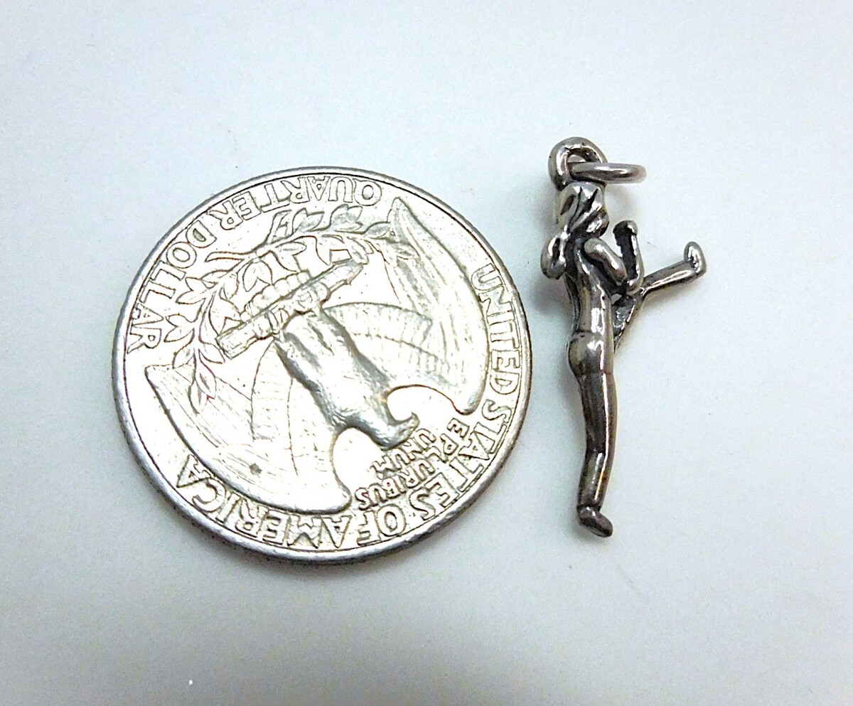 This is a small figure of a girl in a high kick. Use as a pendant or charm. My guess is this is a drill team charm, but not sure at all. It could be for dance, cheerleading, karate or kick boxing as well. Very nicely detailed and in good pre-owned condition with an a purposely antiqued look that gives it depth. It has been tested as sterling silver. I could not find a maker's mark or metal content mark but guarantee it to be sterling. I have many charms to list so view the photos closely for condition and size. Otherwise ask any needed questions.