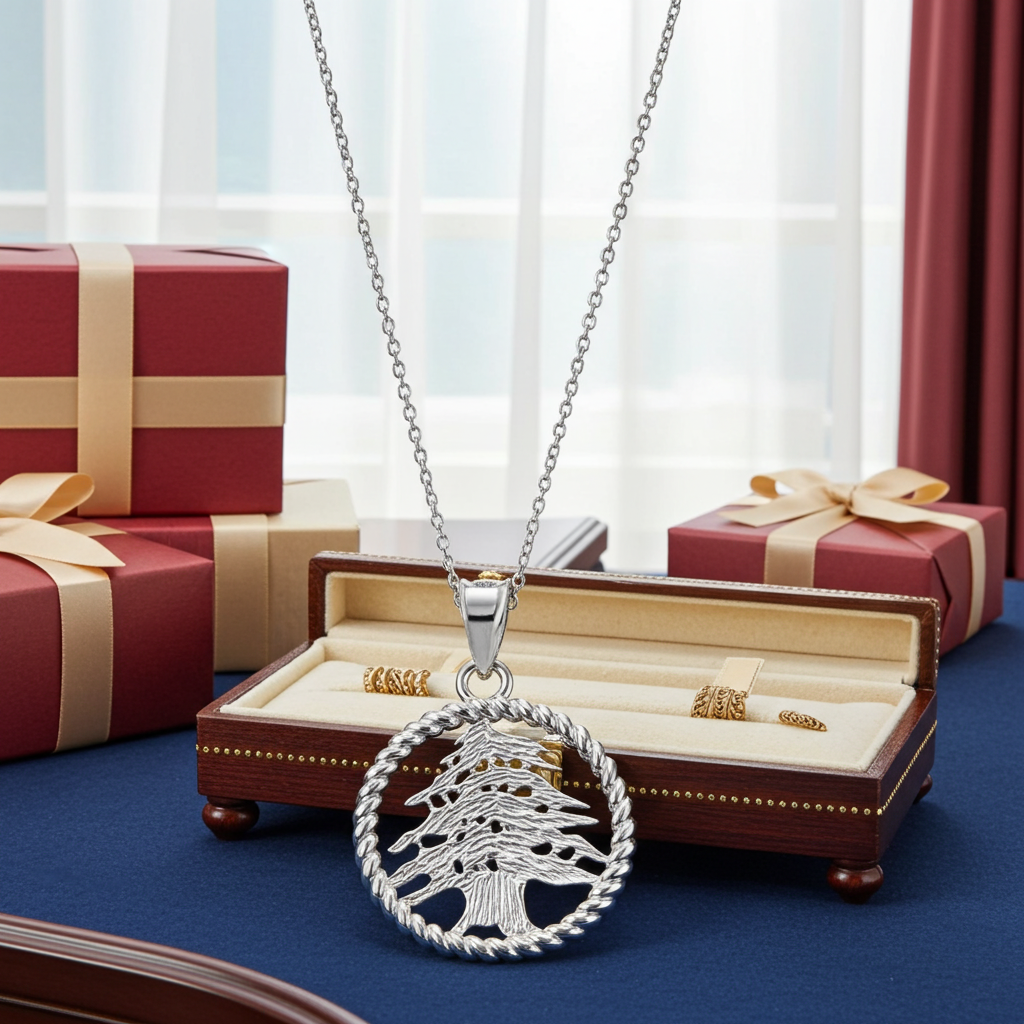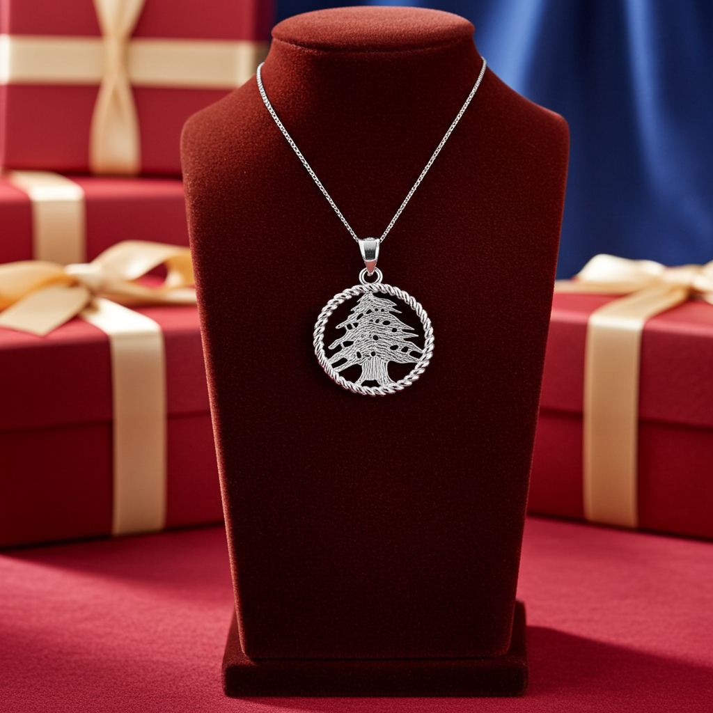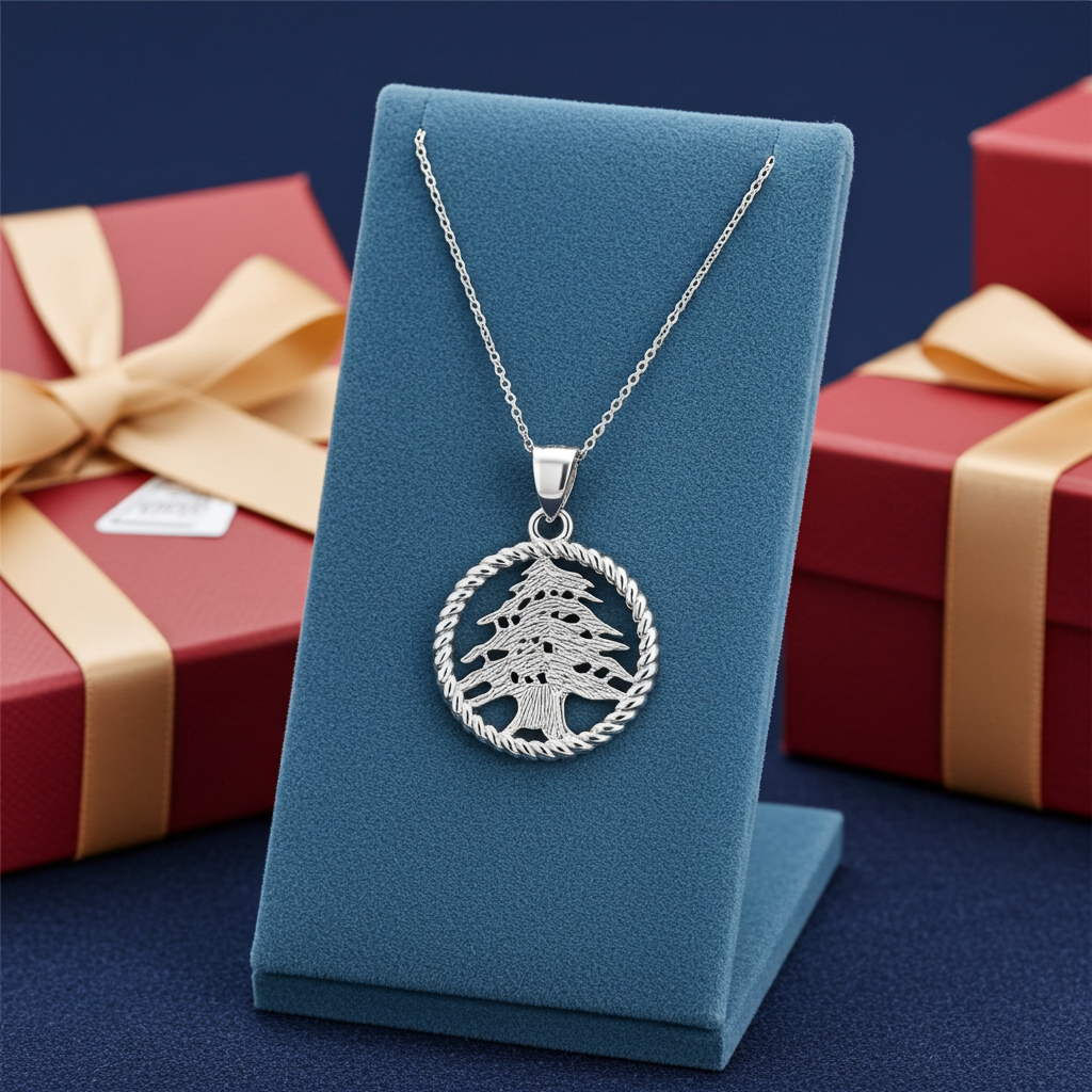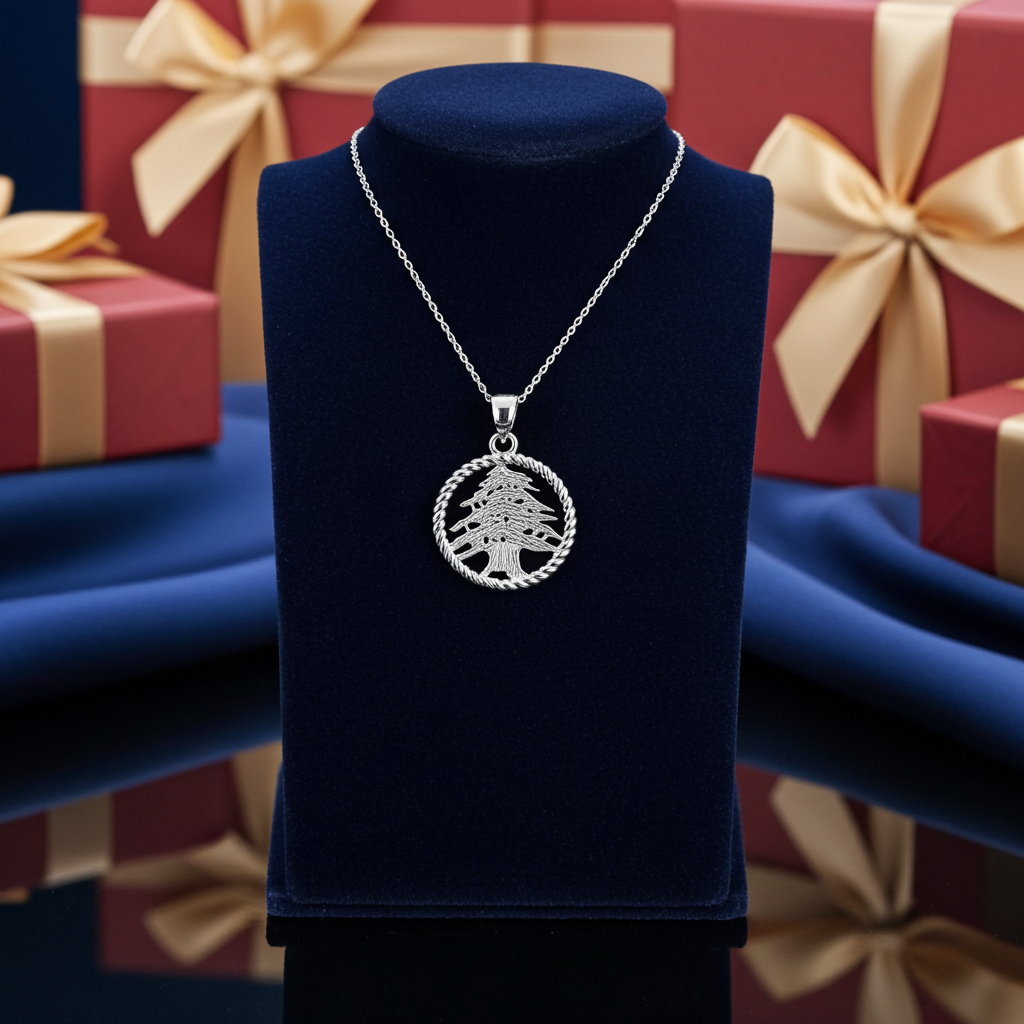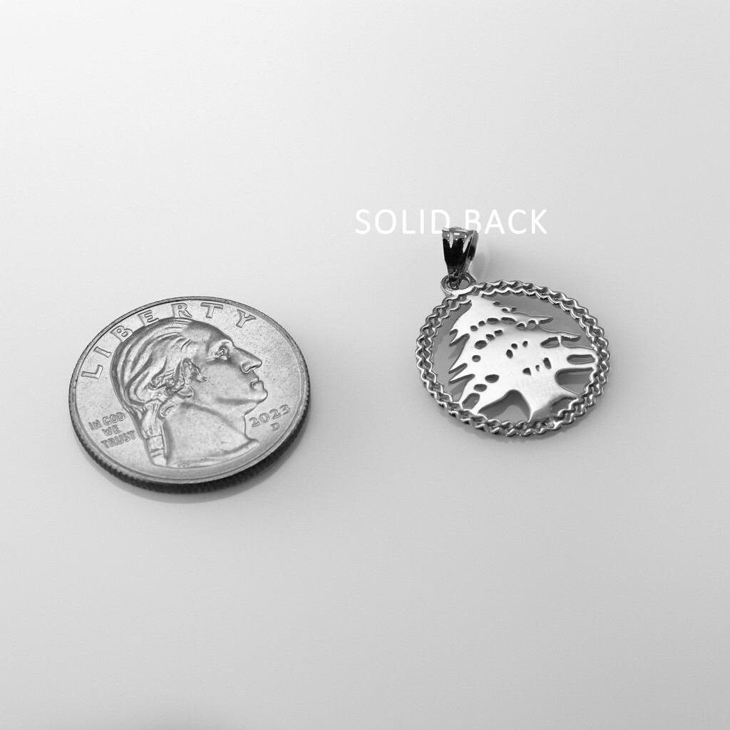 Sterling Silver Lebanese Cedar Tree Pendant with Rope Border Embrace the rich heritage of Lebanon with this Lebanese Cedar Tree sterling silver pendant necklace. Expertly crafted from solid 925 sterling silver, this pendant beautifully represents the Cedar of Lebanon, a symbol of strength, resilience, and national pride. Whether worn as a patriotic piece or a meaningful cultural symbol, this timeless design makes a perfect gift for those who cherish their Lebanese roots. Metal: 925 Sterling Silver. Pendant weight: ?1.5 g. Pendant height (w/ bail): 1" (28 mm). Pendant width: 0.8" (21 mm). Bail opening: 3.5 mm. Finish: polished. Chain length available: 16", 18", 20", 22". Chain type: 0.7 mm Rolo. Chain weight: ?1 g. Clasp: spring ring. Gender: unisex.