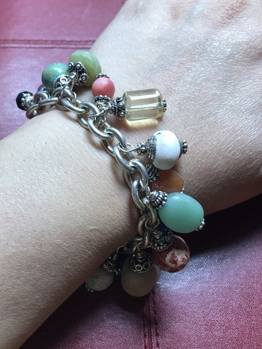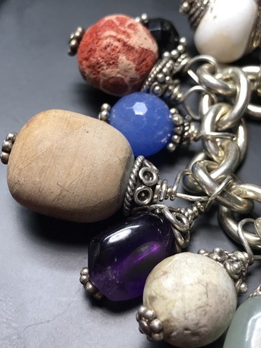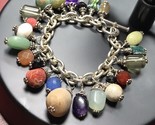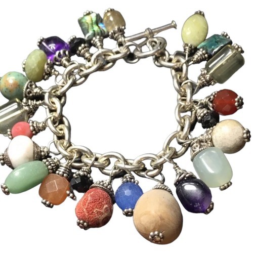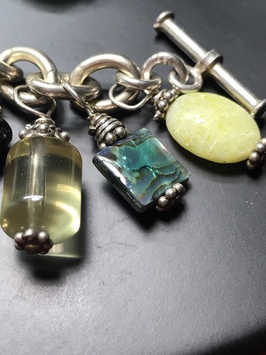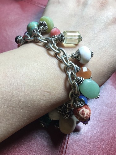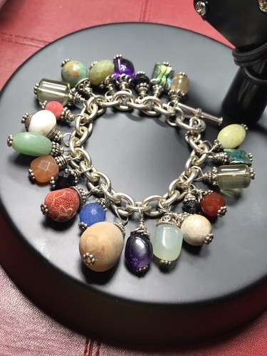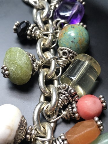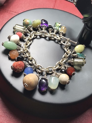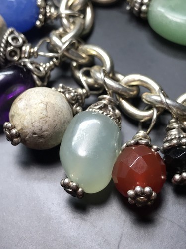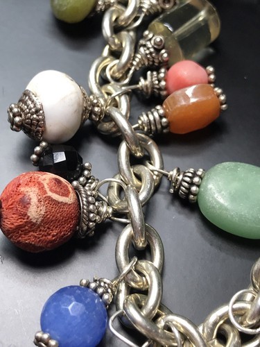 - Sterling Silver Multiple Ornaments Chain Bracelet Multi Colors Stones 7.5” 95 Gr
