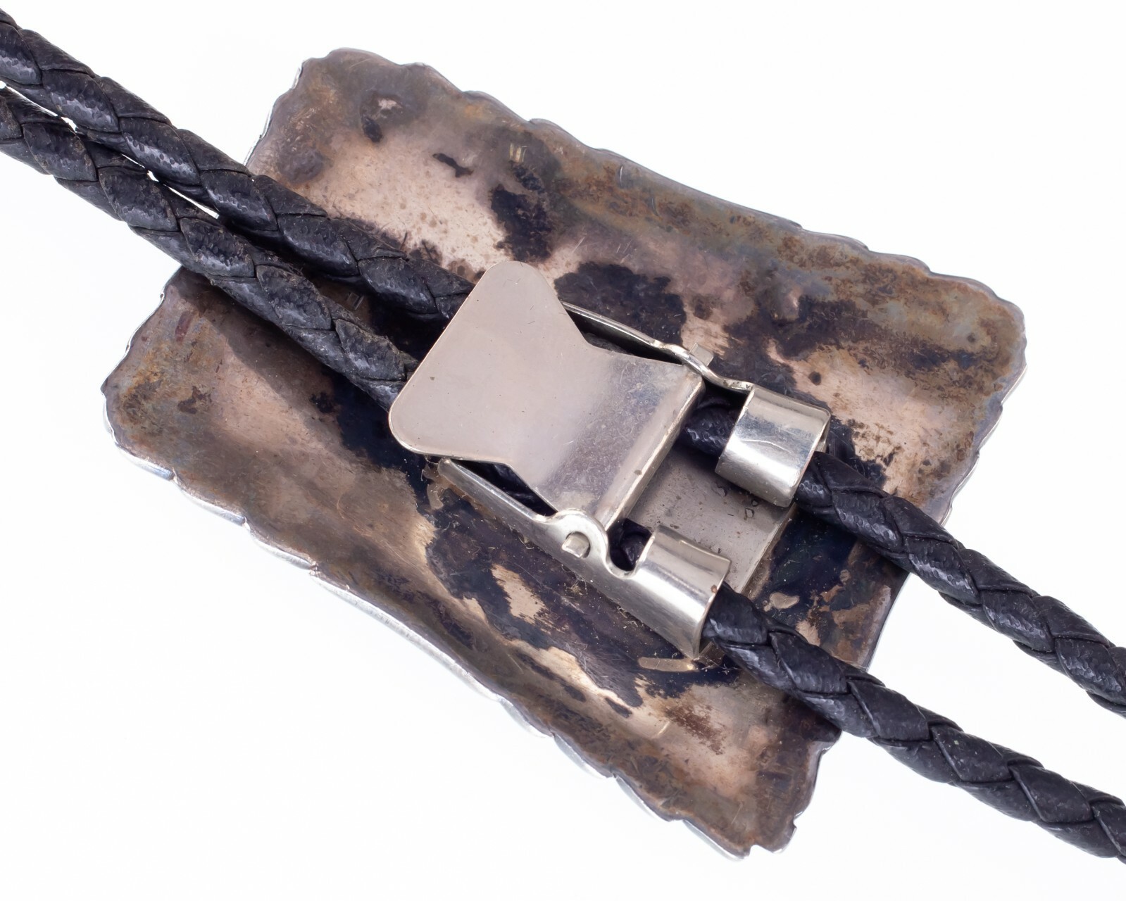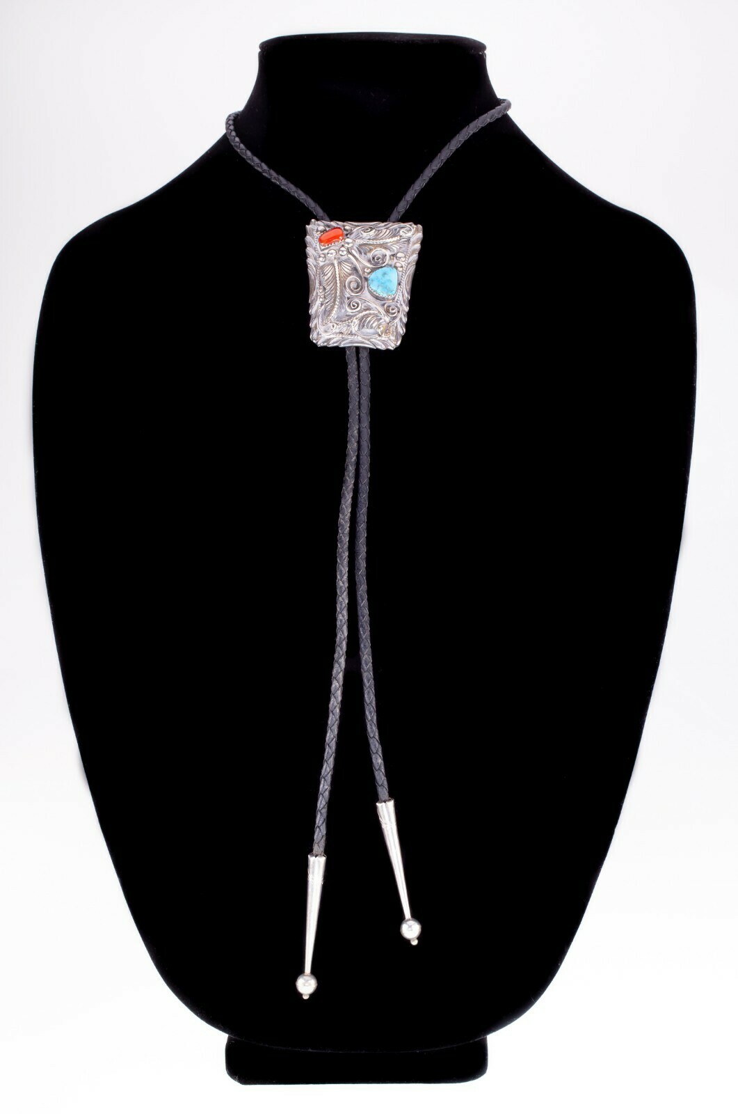 - Sterling Silver Signed FS Bolo Tie with Coral and Turquoise Accents