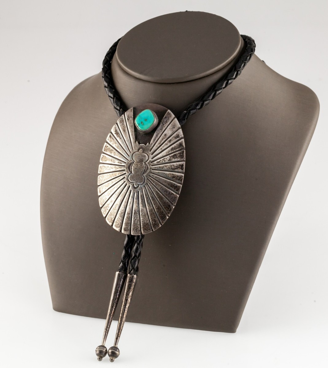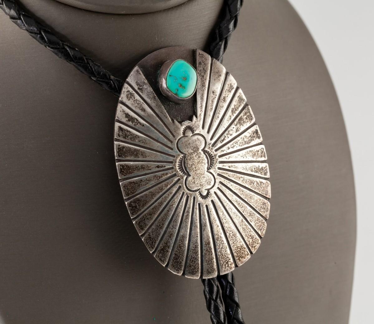 - Sterling Silver Sunburst Bolo Tie with Turquoise Accent Braided Leather