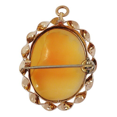 blooming flowers. The cameo is bezel set within a Vermeil frame. A pin shaft holder and a