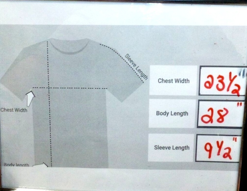 No visible flaws. Measurements: Chest Width = 23.5", Body Length = 28", Sleeve Length = 9.5".