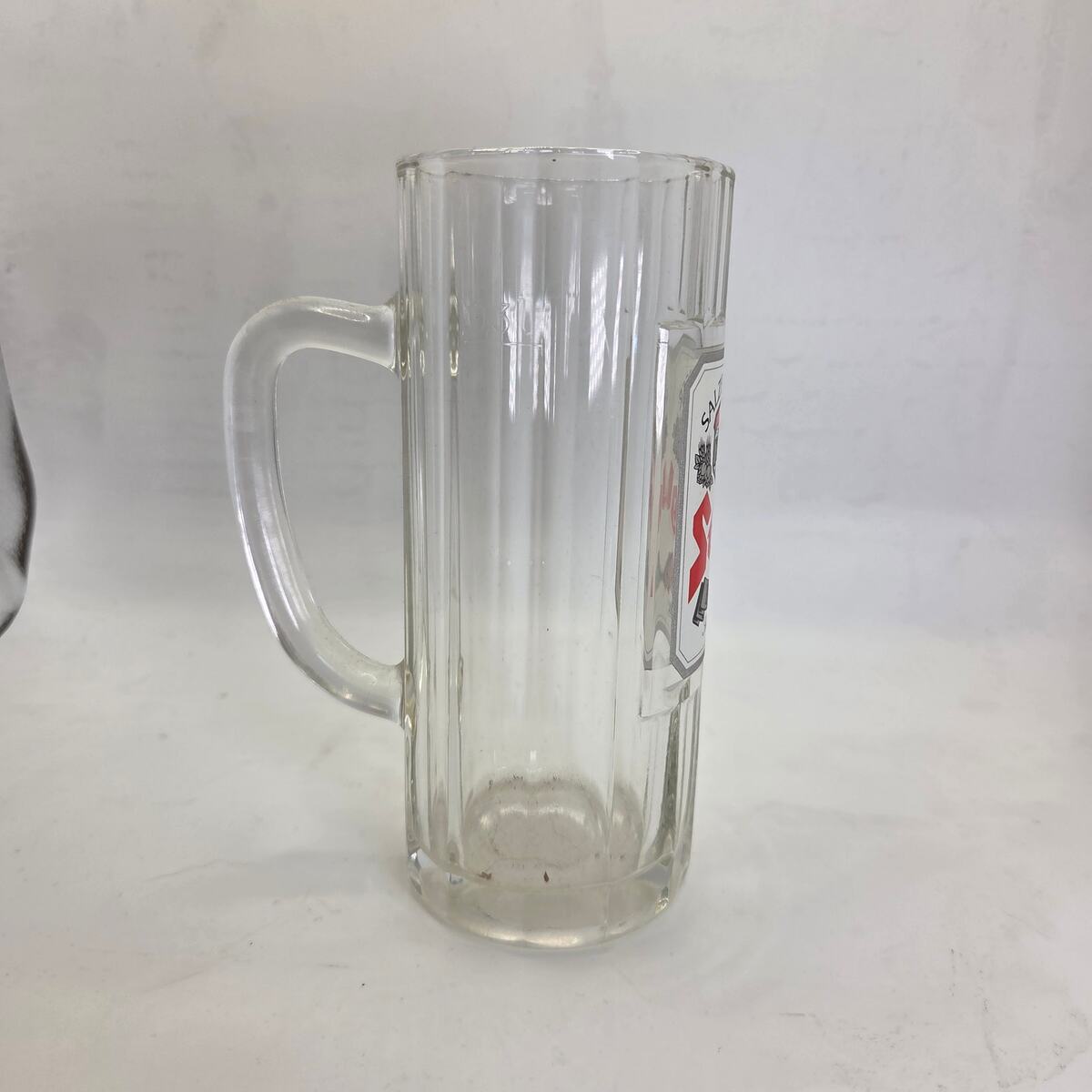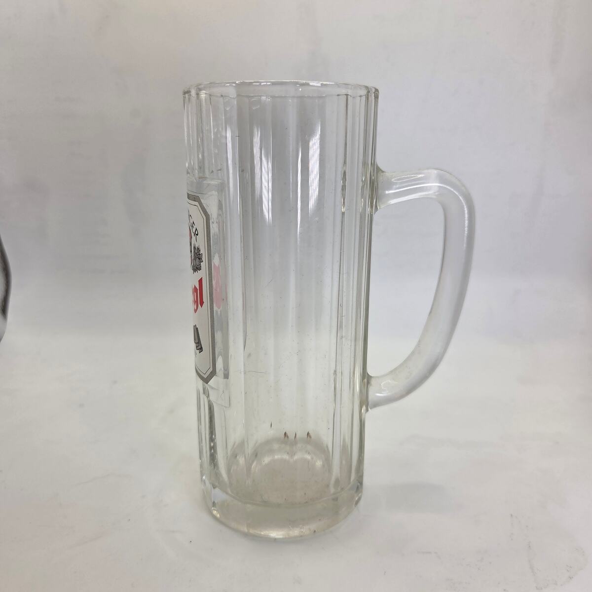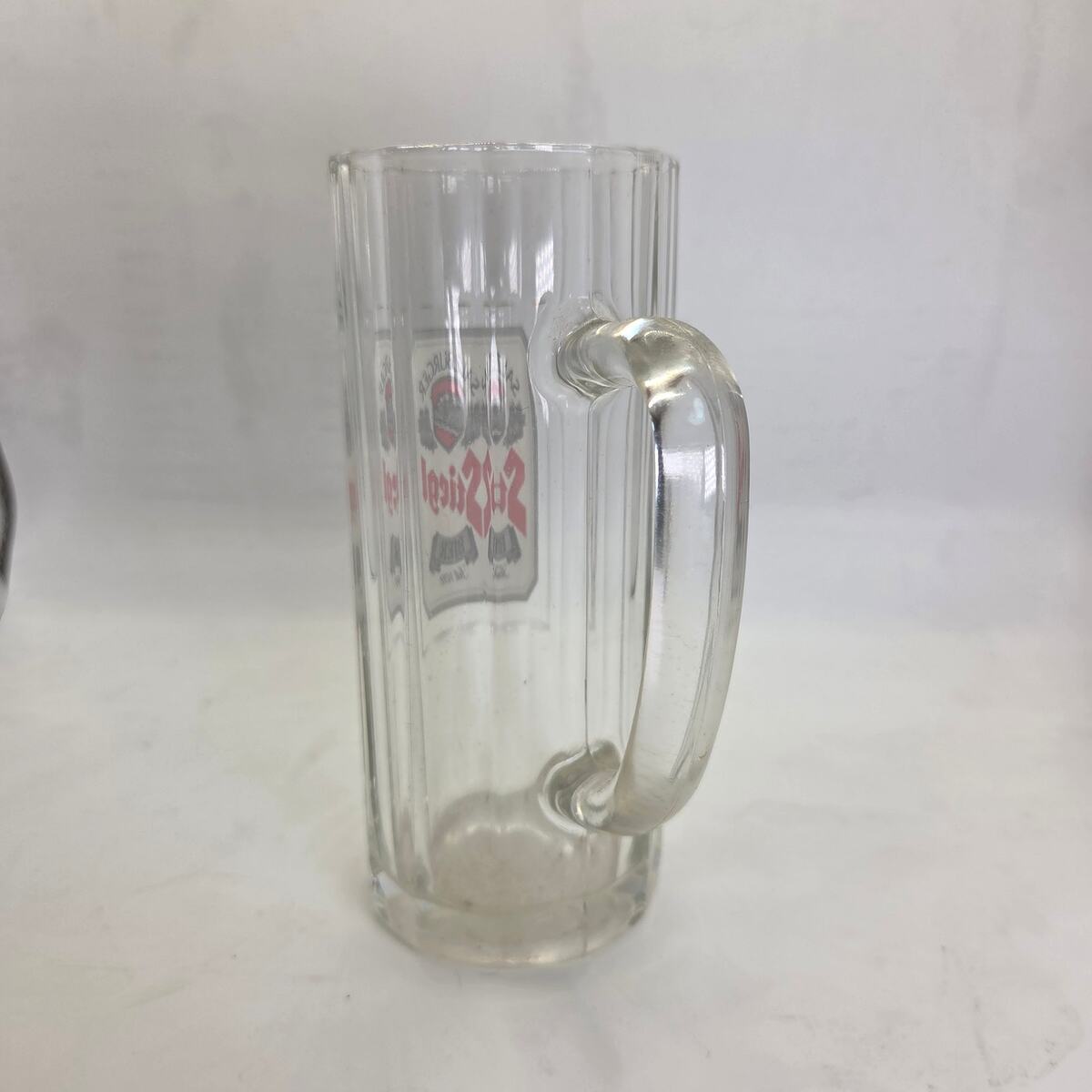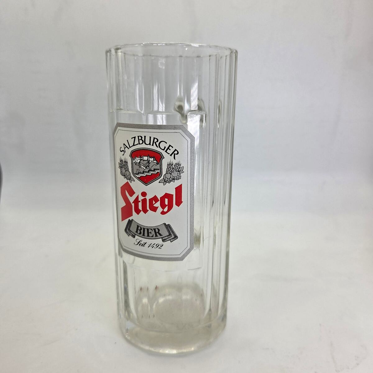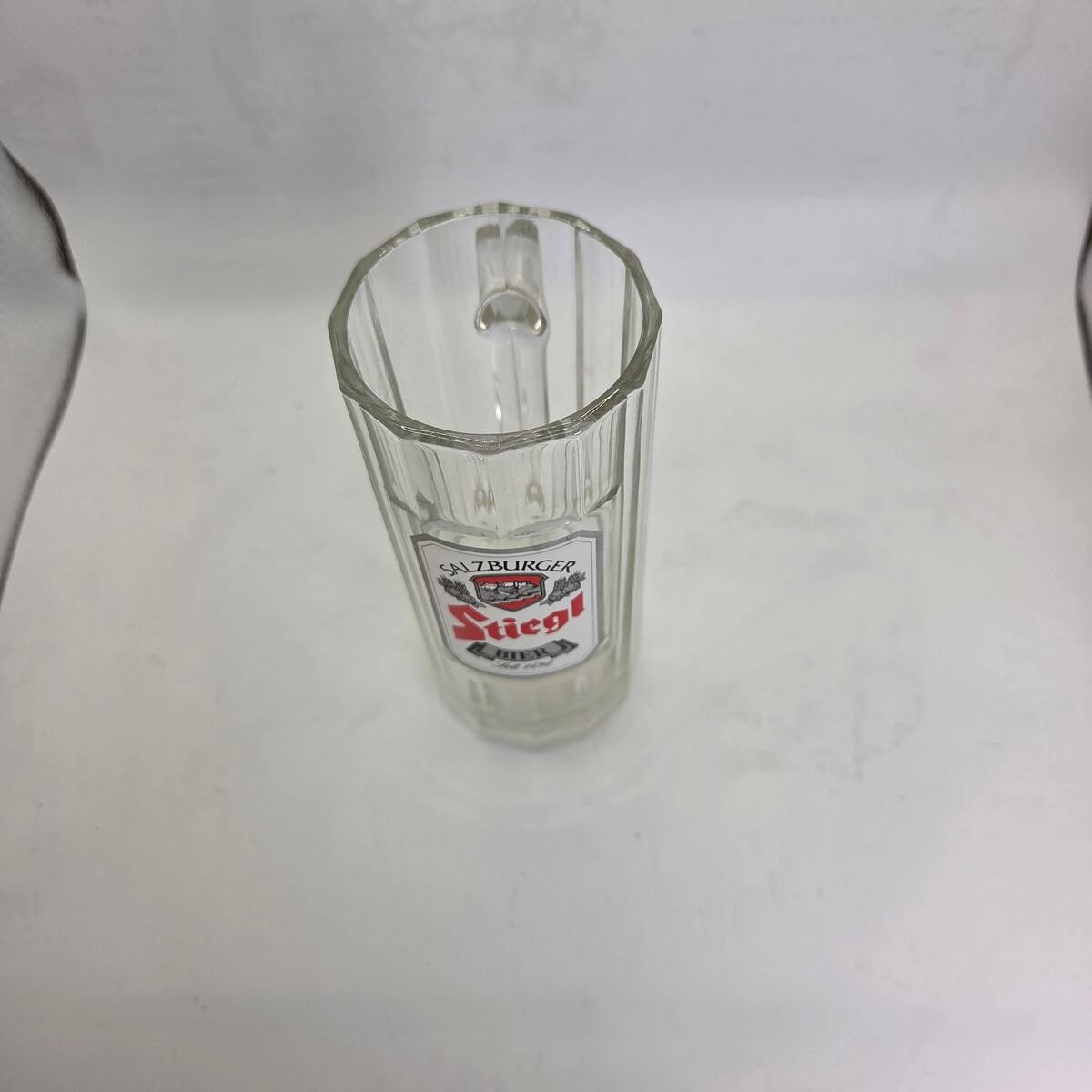 Authentic Salzburger Stiegl Bier glass beer mug featuring the classic red and white brewery logo. Heavy pressed glass with sturdy handle and faceted sides. Measures approximately 6.5" tall and holds about 0.5 L. A great collectible from Austria?s oldest private brewery, ideal for display or everyday use. Genuine Stiegl Bier glass mug Salzburger Stiegl Brauerei, Austria Approx. 6.5" tall, 0.5 L capacity Clear pressed glass with handle Excellent preowned condition ? no chips or cracks