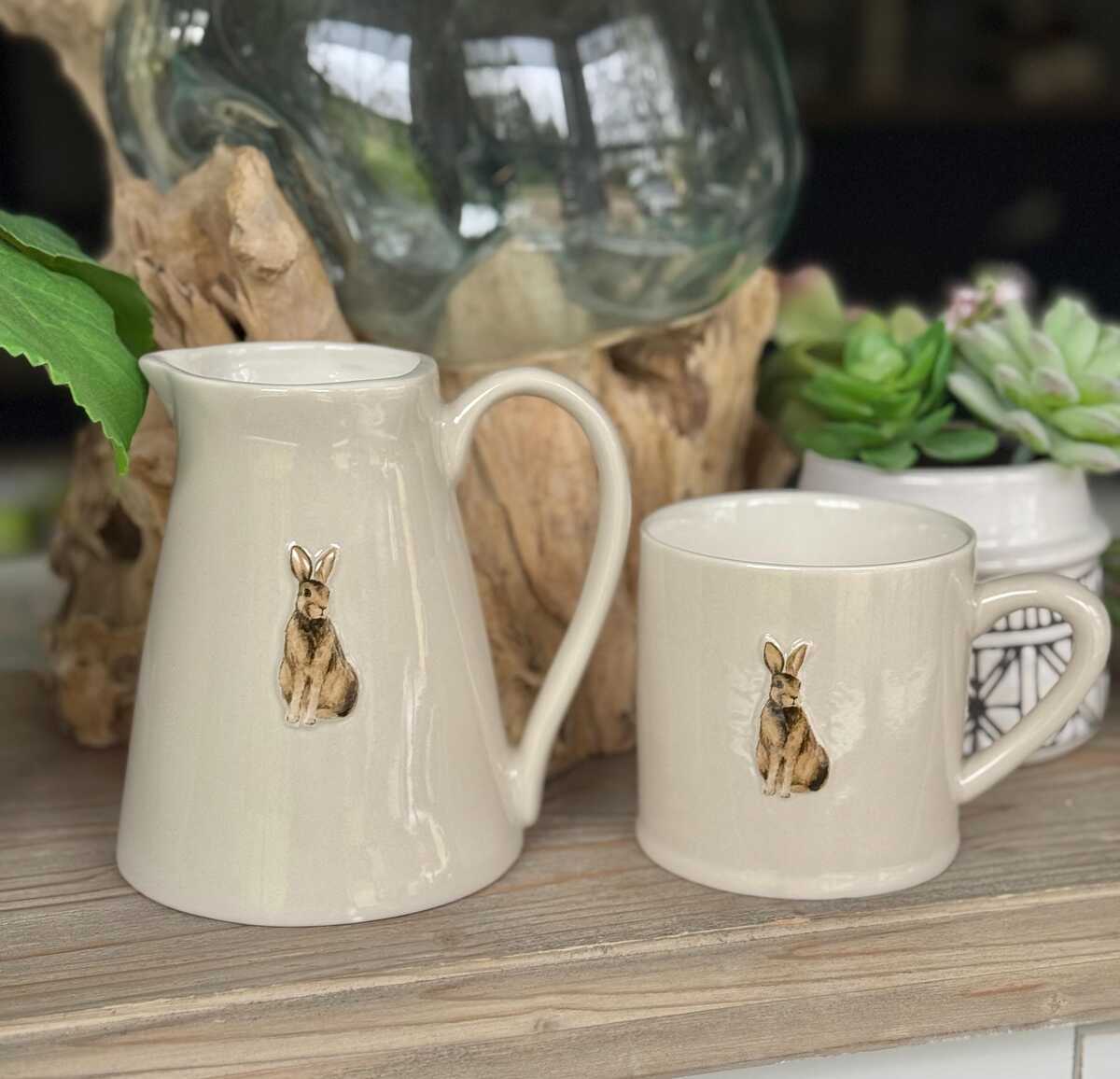 A beautiful cream country themed stoneware mug. Larger than normal featuring an embossed Hare