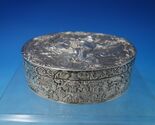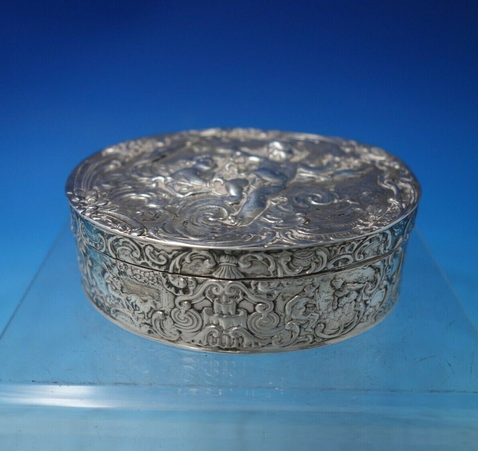 Gorgeous Storck and Sinsheimer of Hanau German .800 silver oval jewelry box featuring winged cherubs. This piece is marked #375 and is circa 1874-1926. The jewelry box measures 3 7/8" x 3 1/4" x 1 1/4" and weighs 4.87 troy ounces. It is not monogrammed and is in good vintage condition. Fantastic!