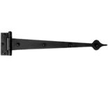 Flush mount spear design strap hinge 10 in for interior and exterior doors. Features removable pin and reversible pads for full or half surface applications. The smooth iron hardware is typical of early American styling with a flat black appearance.