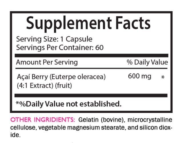 ACAI BERRY EXTRACT: Our powerful dietary supplement designed to support a balanced internal environment and promote optimal well-being. This advanced formula combines the natural benefits of Acai Berry (Euterpe Oleracea) (4:1 Extract) (Fruit) with a blend of potent ingredients known for their properties.