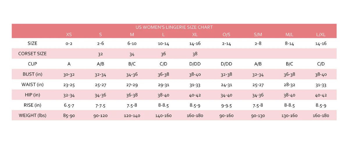 XLarge. Size: 14-16. Cup: D/E. Bust: 38"-40". Waist: 31"-33". Hip: 40"-42". Inseam: 36". Rise: 8.5"-9". Weight: 160-180lbs.