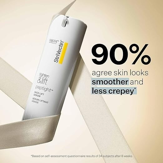 StriVectin TL Peptight Face Lift Serum is a powerful tightening and lifting treatment clinically proven to deliver visible results on sagging and crepey skin. Formulated with advanced peptides and brightening actives, it helps improve skin elasticity in just 1 week while targeting the look of dark spots and uneven tone. By 4 weeks, skin appears firmer and more lifted, and by 8 weeks, sagging and loss of definition are visibly improved. This lightweight yet potent serum replenishes moisture, enhances radiance, and leaves skin looking smoother, toned, and more youthful.