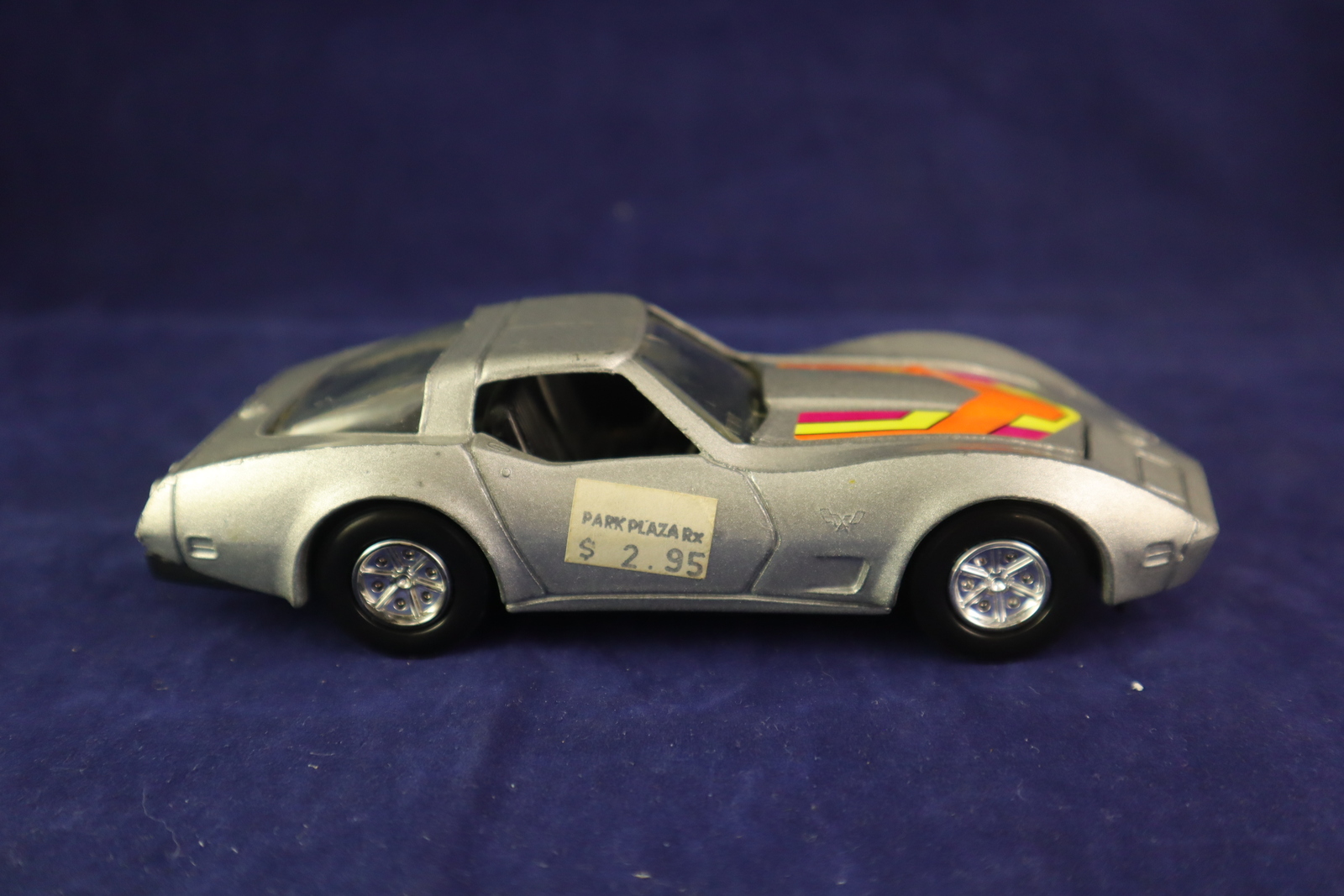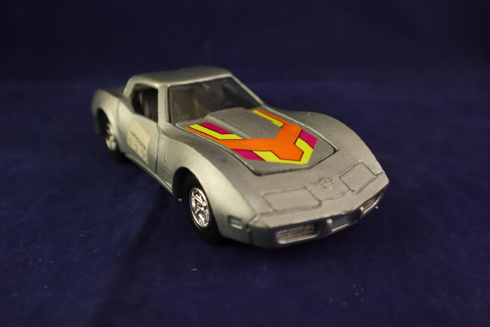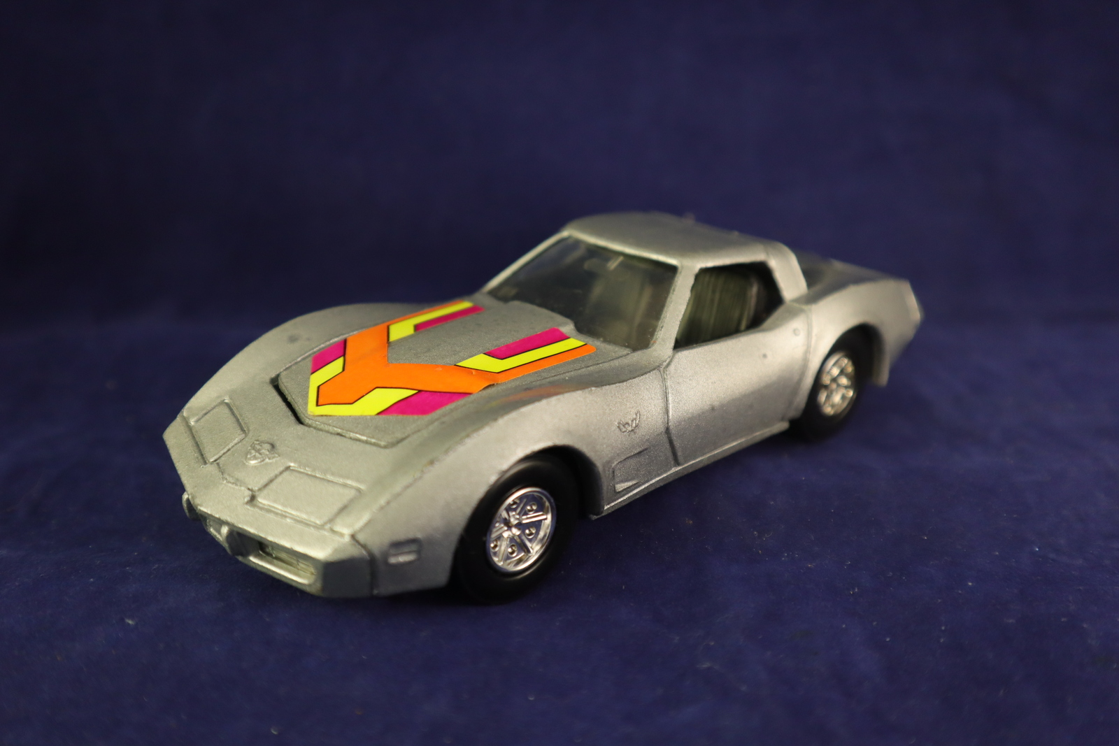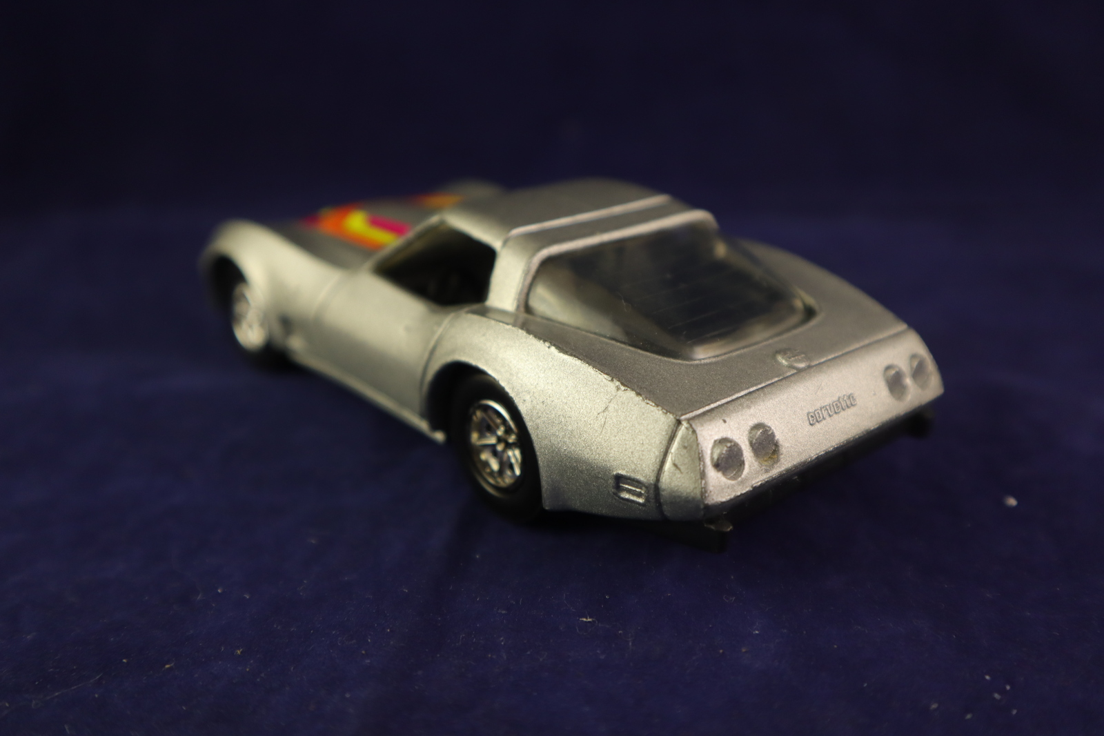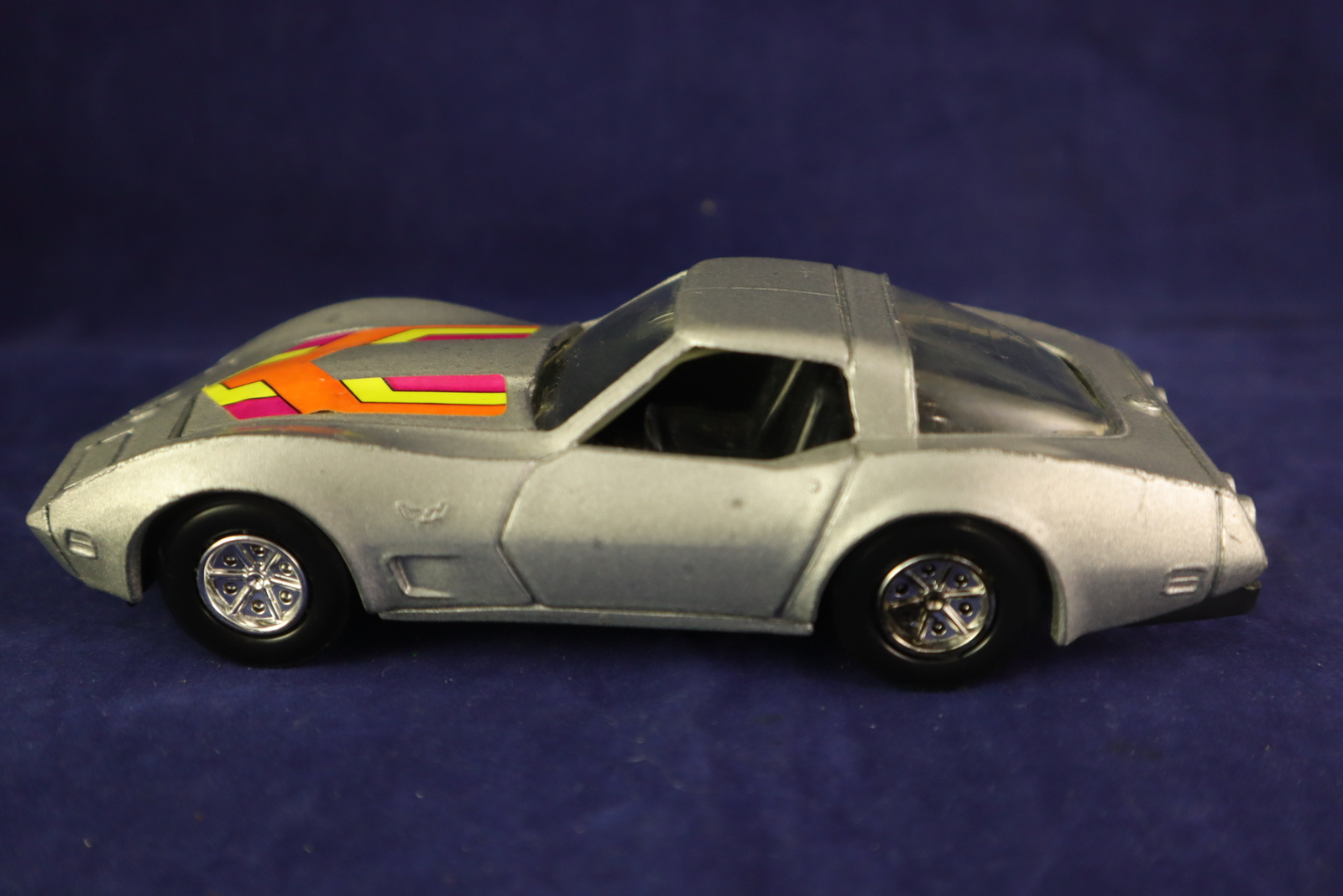 Other Information: This diecast is a 1/30 scale model of a Chevrolet Corvette (a 1978-1982 C3 from what I can tell) made by Strombecker. It is silver in color and features an opening hood.