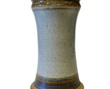 6 1/2? tall stoneware container Has hole in bottom so not a vase Would be nice in kitchen for cooking utensils or in art room to organize paintbrushes. Could also hold faux ferns or flowers. Fluted, base is 3.75 inches Opening is 3.25 inches Nice handmade decorative piece