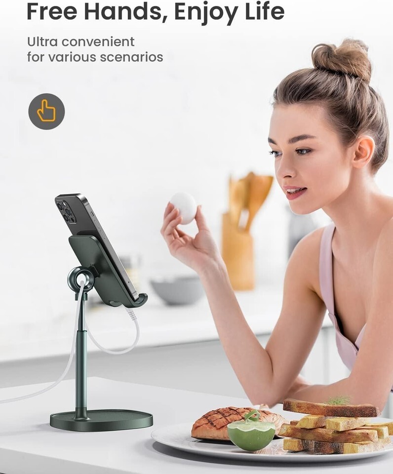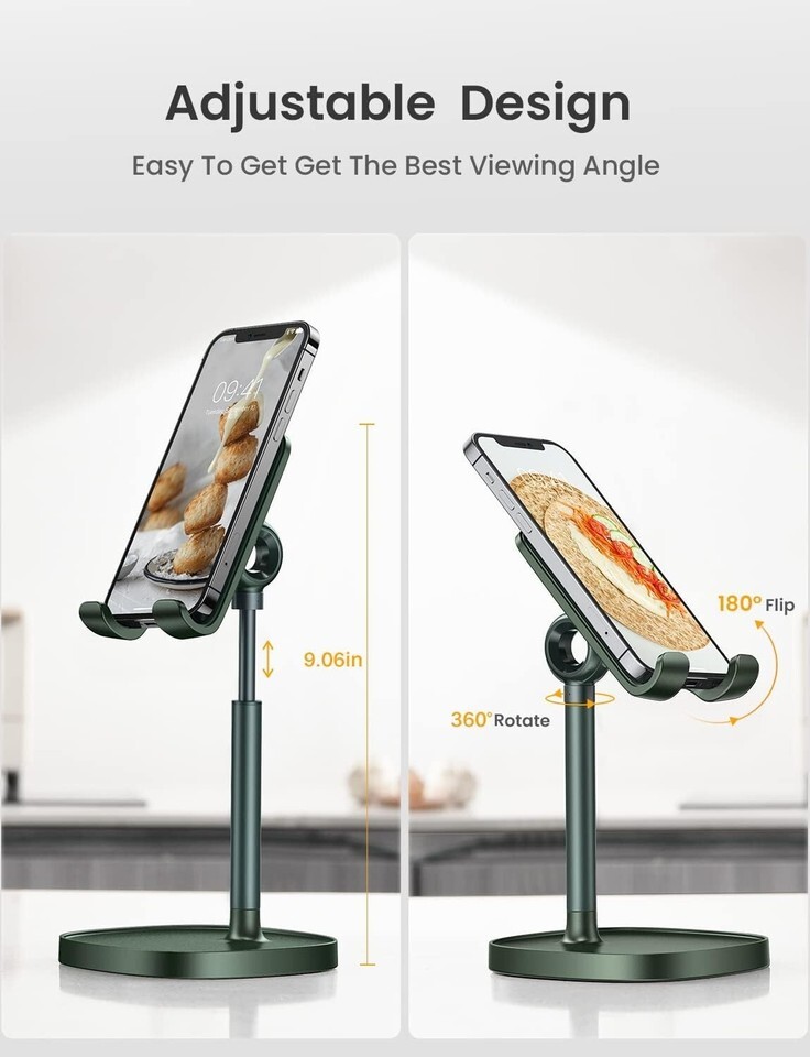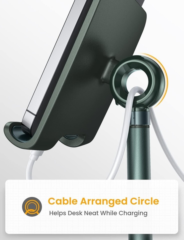 - Sturdy Aluminum Cell Phone Stand with Adjustable Height & Wired Charging Hole