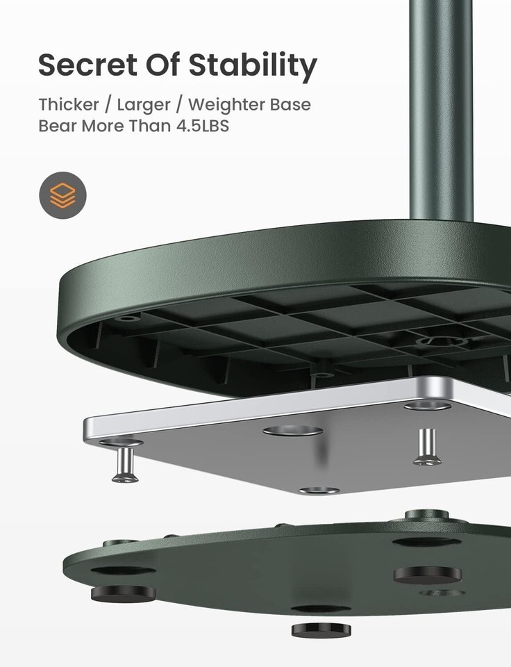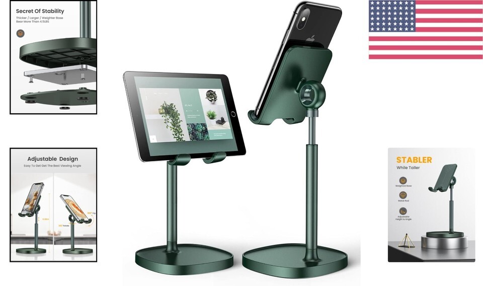 Weighted Anti-Slip Base: Equipped with a weighted base and durable aluminum alloy rod, this stand securely holds all smartphones and small tablets including the latest iPhone models, Samsung Galaxy series, and iPad Mini.