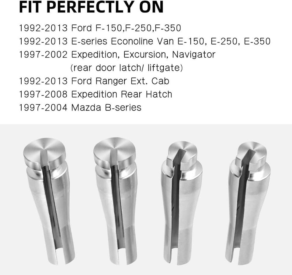 Fit guide includes: 1992-2013 E-Series Vans (E-150, E-250, E-350), 1992-2013 F-Series trucks (F-150, F-250, F-350), 1992-2013 Ford Ranger Ext. Cab, 1997-2002 Expedition, Excursion, Navigator (rear door latch/liftgate), and 1997-2004 Mazda B-series.