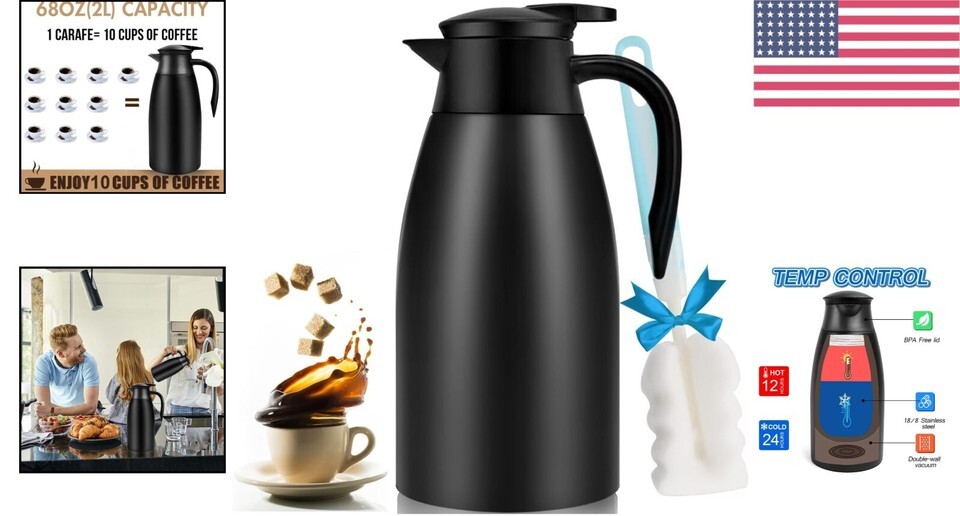 - Stylish 68oz Black Vacuum Insulated Coffee Carafe - Includes Free Cleaning Brush