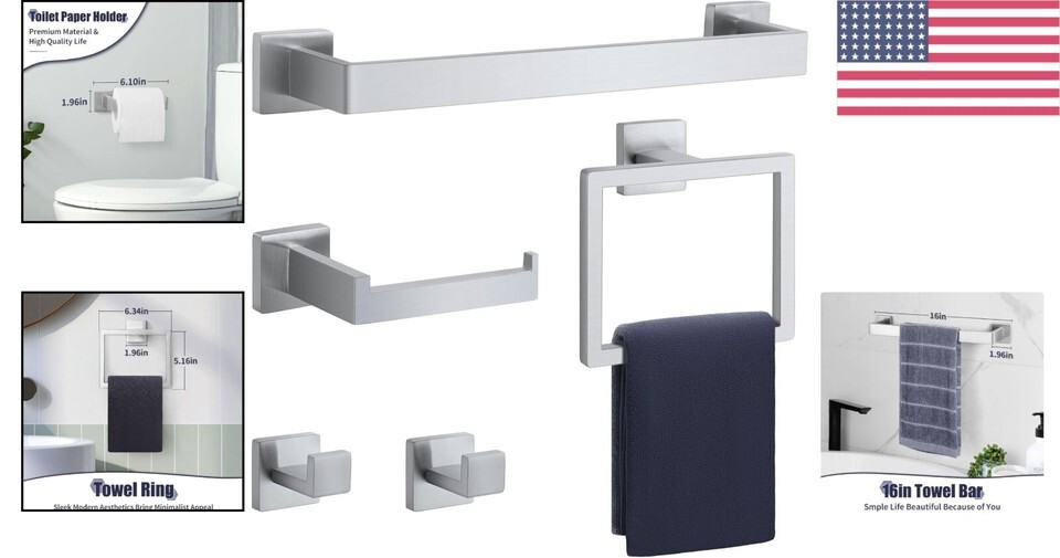 Set Includes: Toilet Paper Holder,Towel Ring,16 Inch Towel Bar,2Towel Hooks,Towel Bar,Towel Hooks