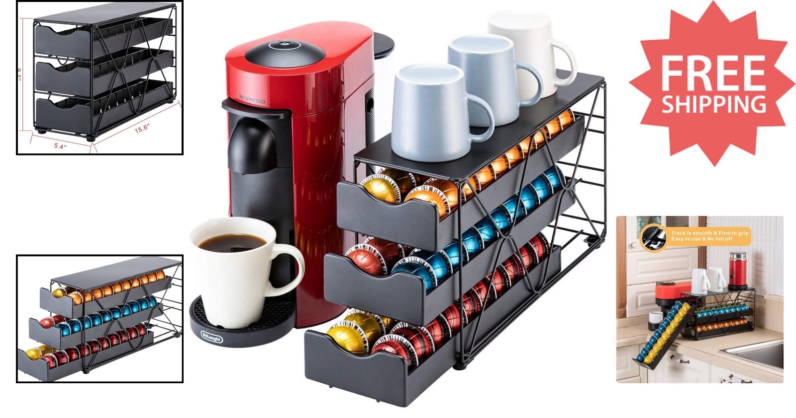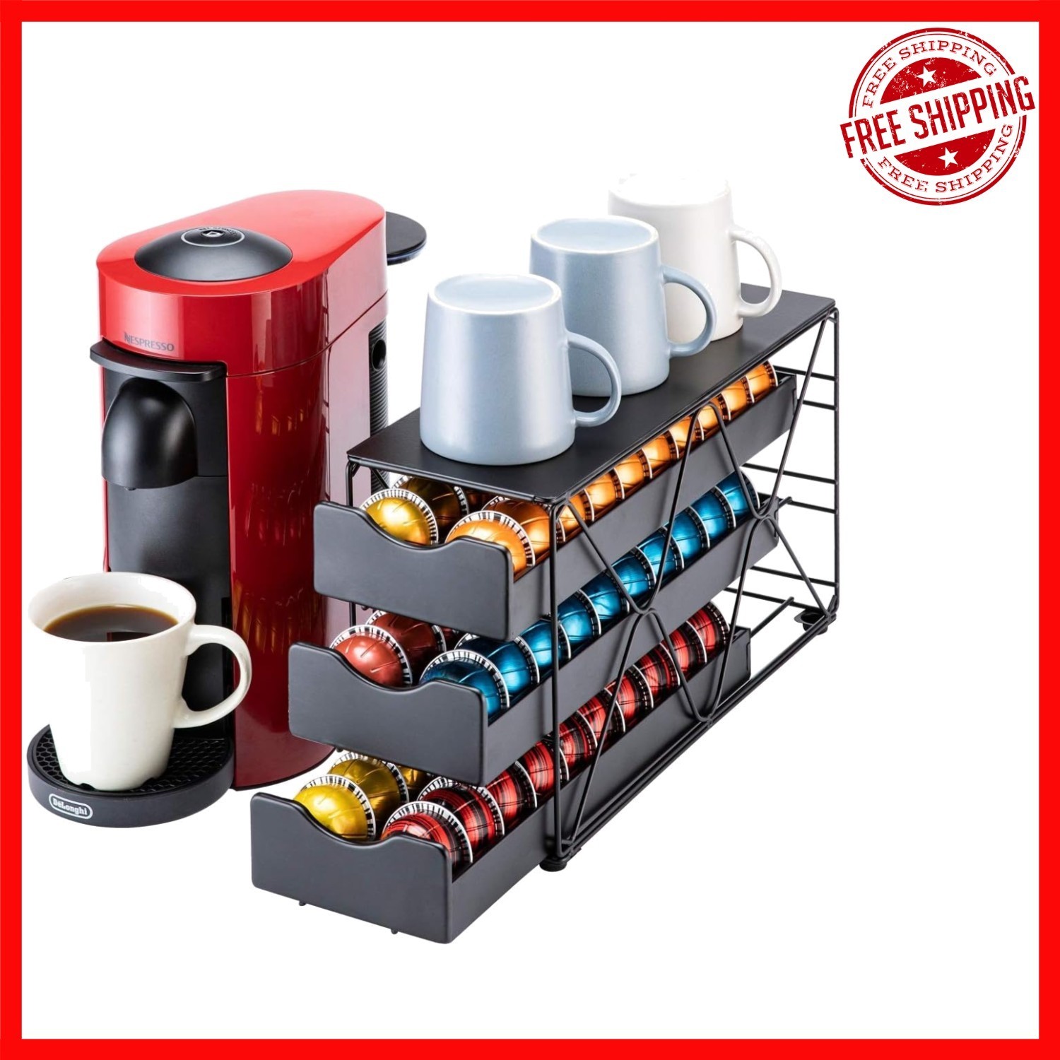 Organize your Nespresso Vertuo capsules efficiently with our modern, stylish multi-layer pod holder. Featuring a 60-capacity design across three tiers, each able to hold 20 pods, it keeps your favorite coffee flavors within easy . The sleek, compact size (5.4'' x 15.6'' x 9.1'') saves space on your countertop while accommodating up to six Vertuo pod boxes. Constructed with a durable metal frame, this holder offers stability and longevity. Easy-to-use pull-out drawers and a hollow design simplify capsule organization, complemented by free flavor labels. Plus, top placement for mugs and accessories keeps everything in one convenient spot. To ensure fast and reliable delivery, we work with multiple fulfillment partners and suppliers. Depending on availability and location, your order may ship from different warehouses or arrive in packaging that varies from item to item. Tracking details are typically provided shortly after shipment, and customer satisfaction remains our top priority. Please note that due to carrier policies and regional regulations, certain items may not be eligible for delivery to specific states or territories.