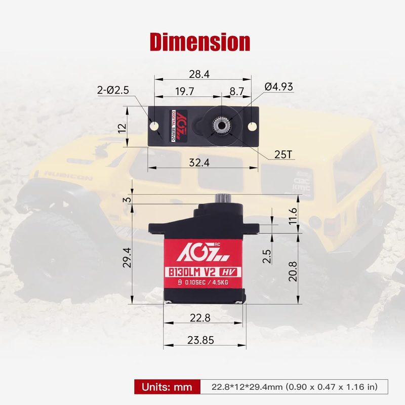 Operating Voltage 4.8V ~ 8.4V Operating Temperature -15C~ +70C Horn Gear Spline 25T-?4.94mm Bearing Double Ball Bearings Case Material AL+Plastic Net Weight 17g (0.60oz) Wire JR 180mm / 26AWG Dimension 22.8*12*29.4mm (0.90 x 0.47 x 1.16 in)