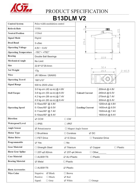 Brand AGFRC Item Name B13DLM V2 Control System PWM Refresh Rate 333Hz Neutral Position 1520uS Signal Range 500 to 2500 uSec Dead Band 3 uSec Operating Travel 18010 ?when 500 to 2500 uSec)