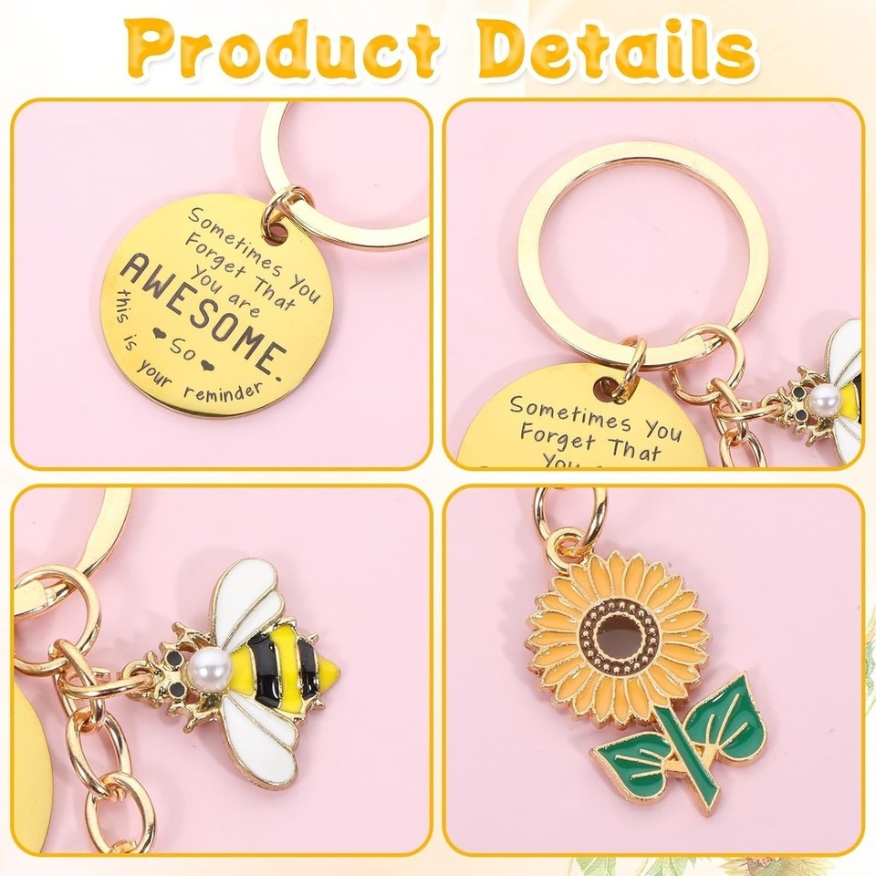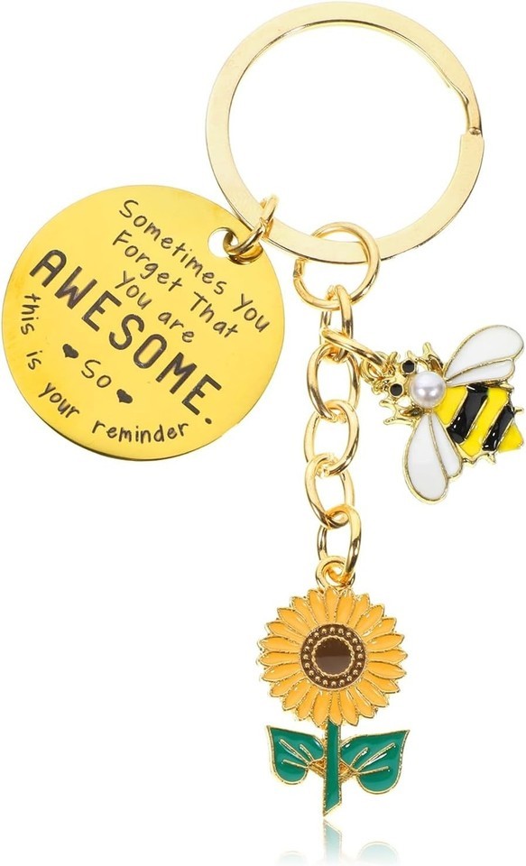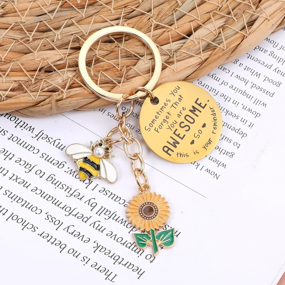 Sunflower Bee Keychain for Women, Sunflower Bag Charm Motivational Keyring, Gold Stainless Steel