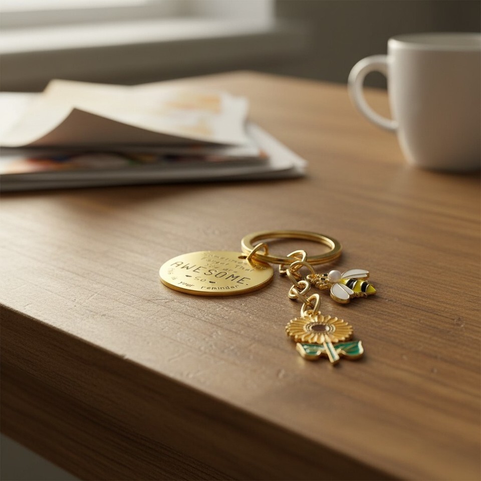 Every glance at this enchanting keychain serves as a reminder of your brilliance and potential, encouraging you to be the best version of yourself. Crafted from durable stainless steel and adorned with a vibrant sunflower and charming bee, this keychain is not only a functional accessory but also a beautiful token of positivity.