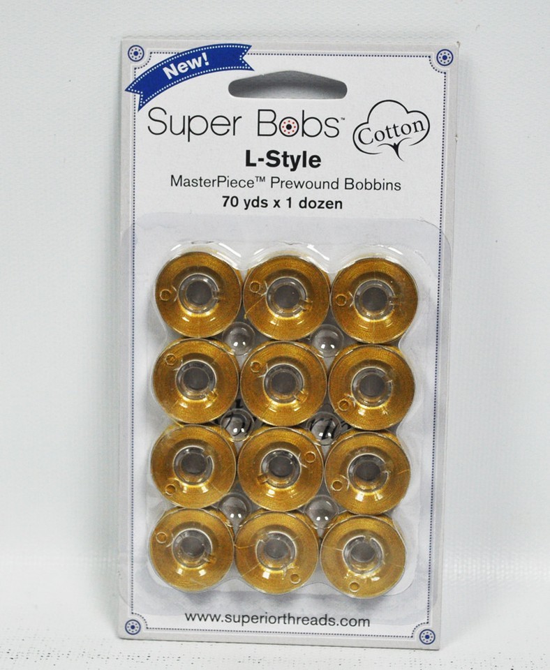 Super Bobs MasterPiece Cotton 70yd Prewound Bobbins 12ct L-Style Bottecelli L Style Bobbins #163 Botticelli. Super Bobs are prewound bobbins that are wound with MasterPiece Egyptian-grown extra-long staple cotton thread. MasterPiece bobbins create precise stitches, have very little lint, and lasts longer due to precision winding. These bobbins hold 30-60% more than a self-wound bobbin. 12 Bobbins in package. L-Style Prewound Bobbins 70 yds x 1 dozen. Wound with MasterPiece 50 wt. 2-ply Egyptian grown extra long staple cotton thread. CHK-149-12-163