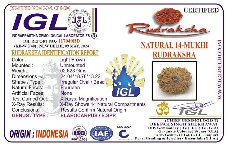Rituals for wearing : Fourteen faced Rudraksha should be capped in gold or silver and stringed in red thread and wear in neck or be kept on the worshipping place chanting the mantra.