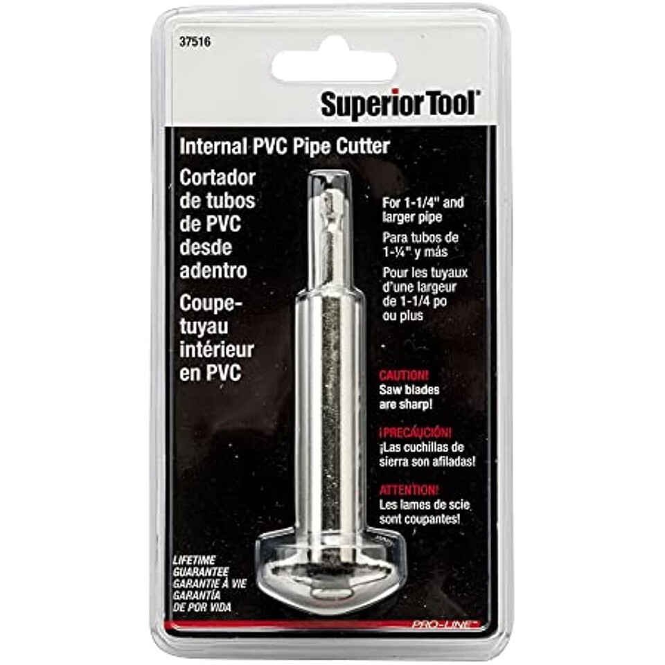 Superior Tools 37516 Internal PVC Pipe Cutter 1.25" is used in places where normal pipe cutting tools cannot fit or to remove welded joint to salvage pipe. Heat treated saw blade. Works with any electric drill.