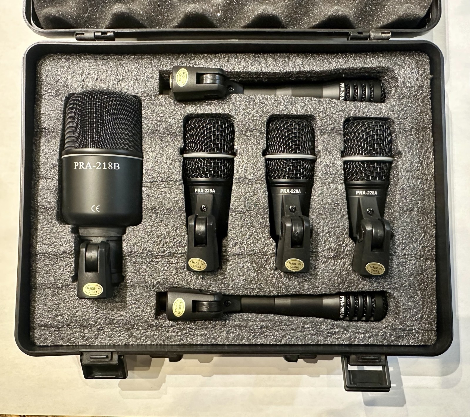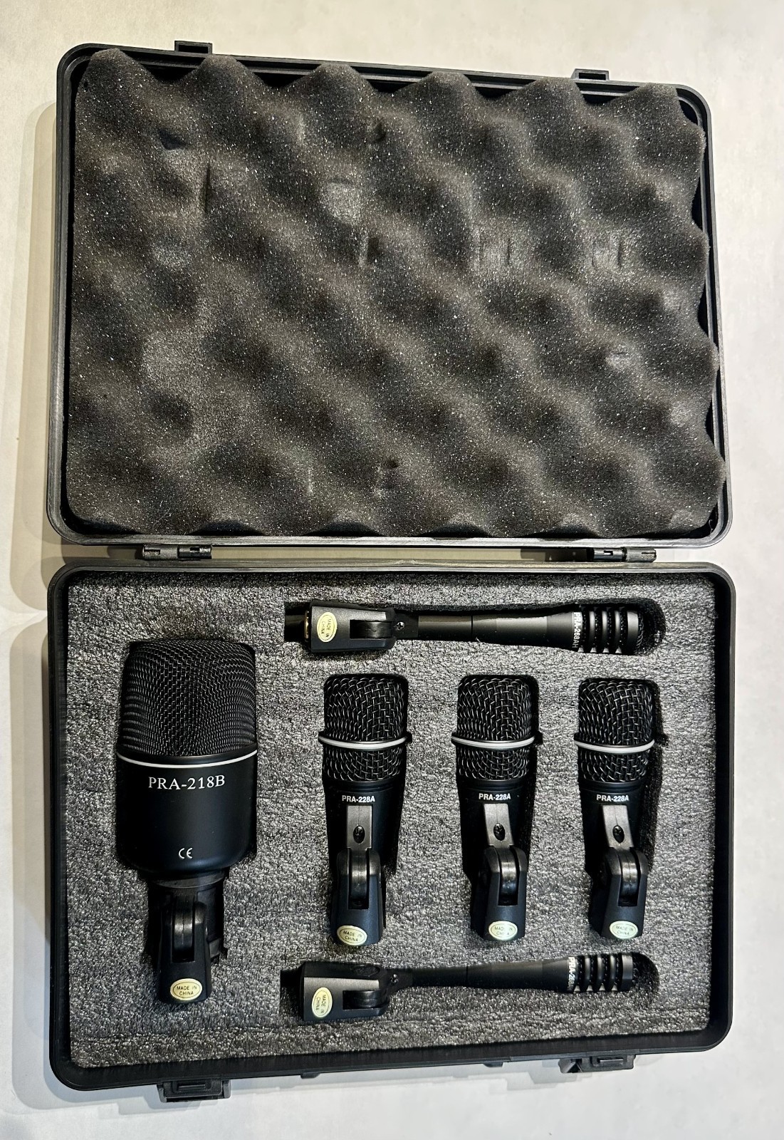 ? Superlux DRK-E4C2 7-Piece Drum Microphone Kit with Case This is a complete Superlux DRK-E4C2 drum mic set, perfect for live performance and studio recording. It includes dynamic microphones for kick, snare, toms, and condensers for overheads or hi-hat, all housed in a protective hard case with foam padding. Includes: 1x PRA-218B (Kick Drum Microphone) 3x PRA-228A (Snare/Tom Microphones) 2x PRA-268AH (Overhead/Hi-Hat Condenser Microphones) Mounting Clips (attached) Original Hard Case with Foam Inserts Condition: Pre-owned but in excellent working condition. All microphones are clean, tested, and fully functional. The hard case has minor scuffs from storage but protects the set well. Please review photos for exact condition. Features: Tailored frequency response for drums percussion Rugged design, built for stage use Foam-lined protective carrying case Great for live gigs, home studios, and recording sessions