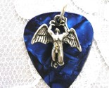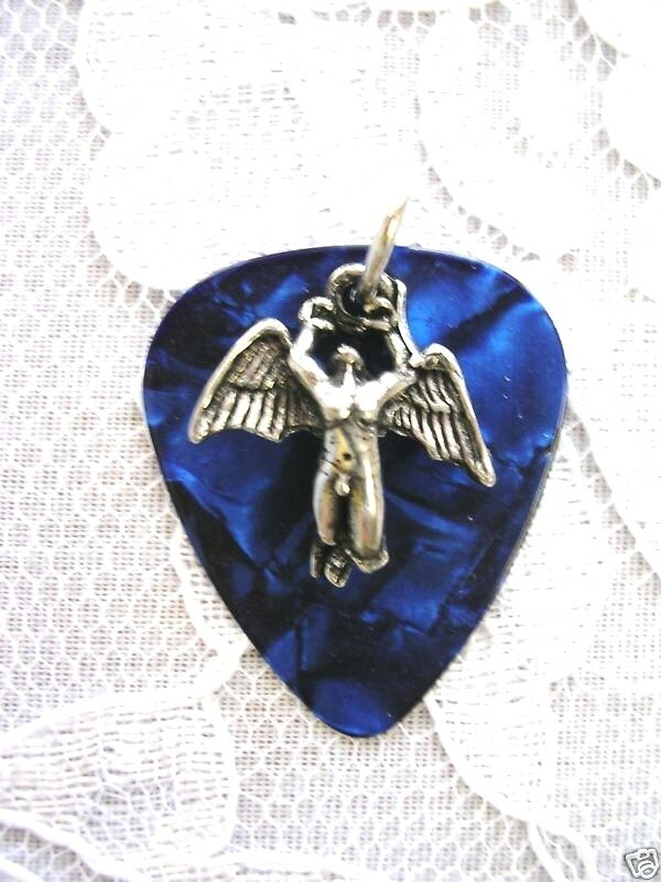 NEW DEEP BLUE CELLULOID GUITAR PICK WITH A USA HAND CAST PEWTER CELTIC LED ZEPPELIN SWAN SONG ANGEL ICARUS CHARM DOUBLE PENDANT NECKLACE