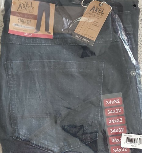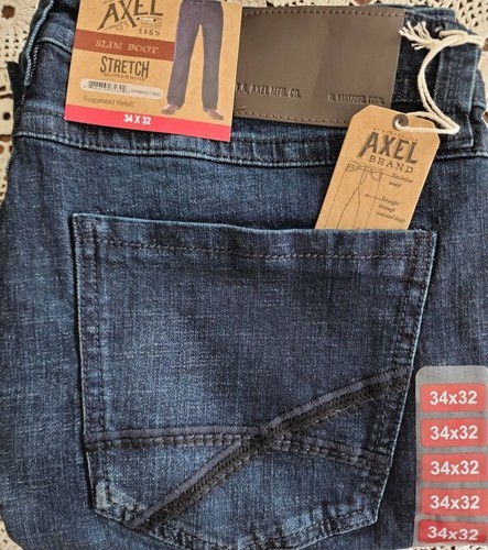This sale is for One (1) Pair of T.K. Axel Brand Jeans Men's size 34 x 32 Model ~ AXMB0057-BND Dark wash Blue in color Slim ~ Bootcut Stretch Sits below waist Straight through seat thigh Pinched knee 18" leg opening Five (5) pocket jeans Zipper one (1) button closure Belt loops around waistband 99% Cotton ~ 1% Spandex Machine wash ~ Tumble dry Jeans are new with tags Please view photos for a good description of this item Thank you!