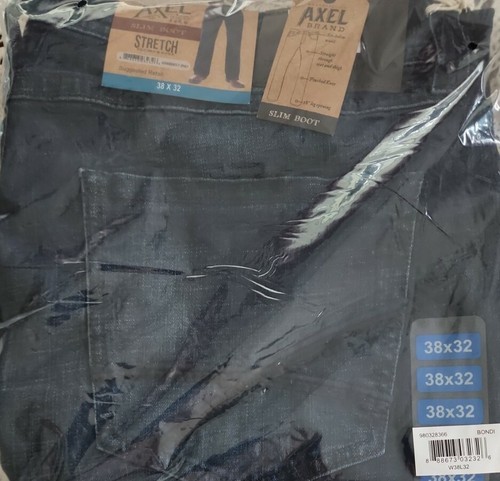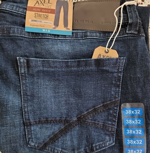 This sale is for One (1) Pair of T.K. Axel Brand Jeans Men's size 38 x 32 Model ~ AXMB0057-BND Dark wash Blue in color Slim ~ Bootcut Stretch Sits below waist Straight through seat thigh Pinched knee 18" leg opening Five (5) pocket jeans Zipper one (1) button closure Belt loops around waistband 99% Cotton ~ 1% Spandex Machine wash ~ Tumble dry Jeans are new with tags Please view photos for a good description of this item Thank you!