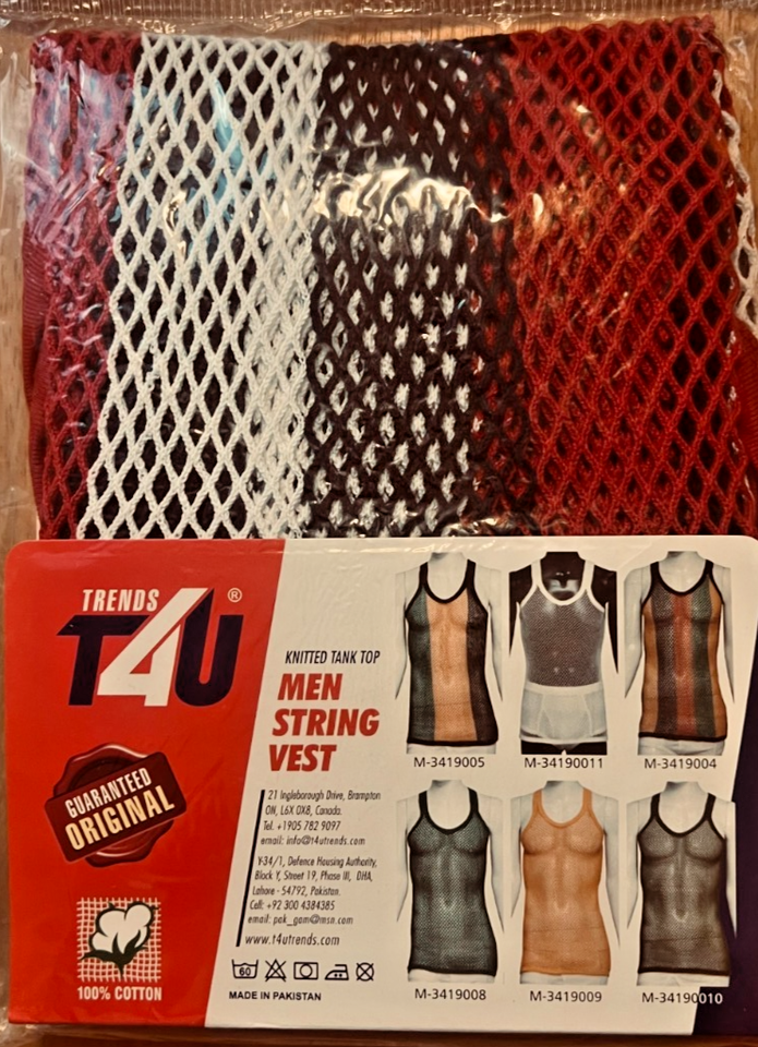 T4U Trends Men's Knitted Tank Top Men String Vest Color is American Flag Colors (Red, White, and Blue Stripes) Size is Large 100% Cotton New in Sealed Package Machine Washable Item number is M-3419007 Summer Ventilations and winter warmth. Fishnet style