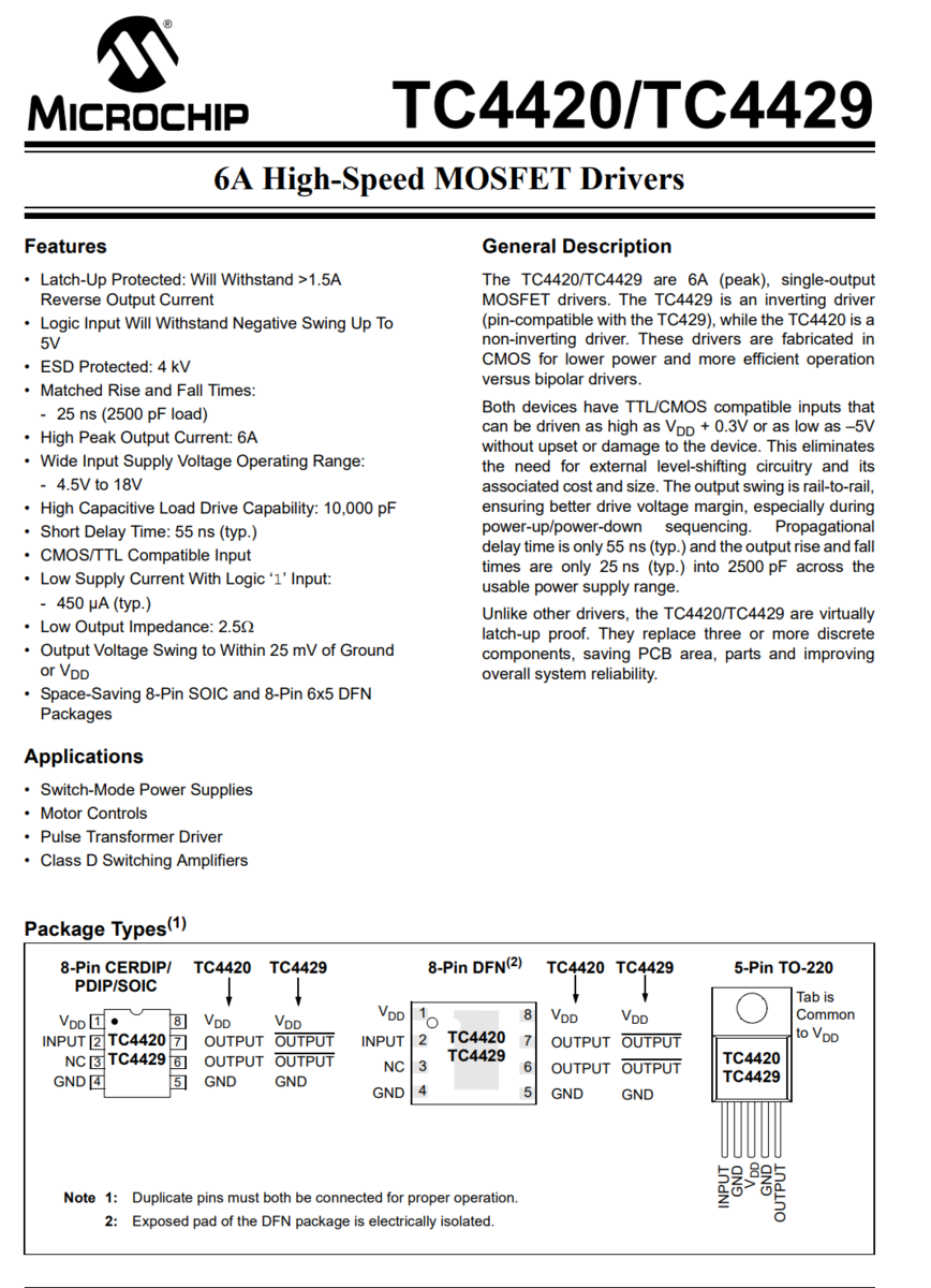 1X TC4429CPA Microcihp 6A Inverting High Speed MOSFET Gate Driver 4.5V to 18V DIP-8