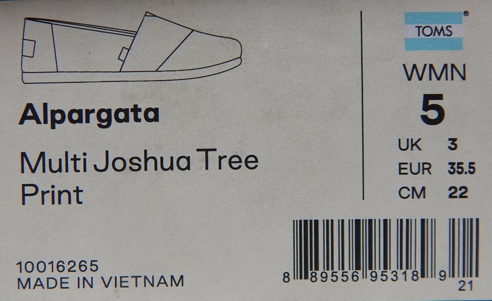 TOMS Alpargata Sz 5 M EU 35.5 Women's Slip-On Loafers Multi Joshua Tree 10016265 THIS SHOE'S CONDITION: NEW WITH BOX. -Notes: IF THE ITEM IS NOT TO YOUR EXPECTATION WE OFFER A 30 DAY RETURN POLICY. ABOUT US: We specialize in footwear shoe accessories at a highly discounted price. We have a selection of new shoes, and also some displays, demos, pre-owned as well. PHOTOS: New Shoes: We usually send the the exact shoes pictured but may occasionally use our own stock images to represent several shoes. Store Displays, Demos, Pre-owned Shoes: We will send the EXACT shoes pictured here. A NOTE ABOUT OUR PRE-OWNED SHOES: We try to catch everything and describe it in the listing, but there are some things we may miss on occasion. This is why we take several pics of all pre-owned shoes from every angle possible so you as the buyer see what you will be getting. Also, because we are re-sellers we do not know the exact mileage of the shoes. SHIPPING: Shoes are in stock and ready to ship. We have a 1 day handling time but will usually ship same day if you purchase before 3PM Central Standard Time Need the item faster? We offer priority, expedited, and express one- day shipping on nearly all of our items We will combine shipping for expedited and one day deliveries. International Buyers Please Note: Import duties, taxes, and charges are not included in the item price or shipping cost. These charges are the buyer's responsibility. Please check with your country's customs office to determine what these additional costs will be prior to bidding or buying. QUESTIONS? Message us- we are usually very fast at responding! Listing and template services provided by inkFrog