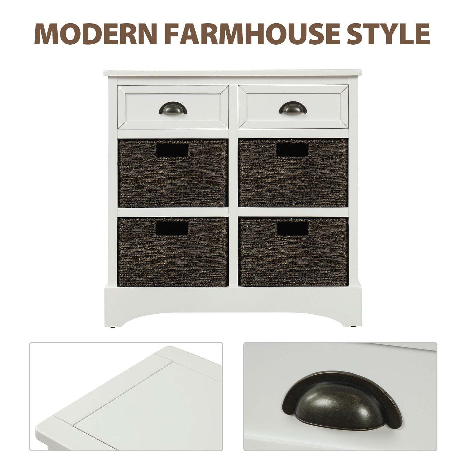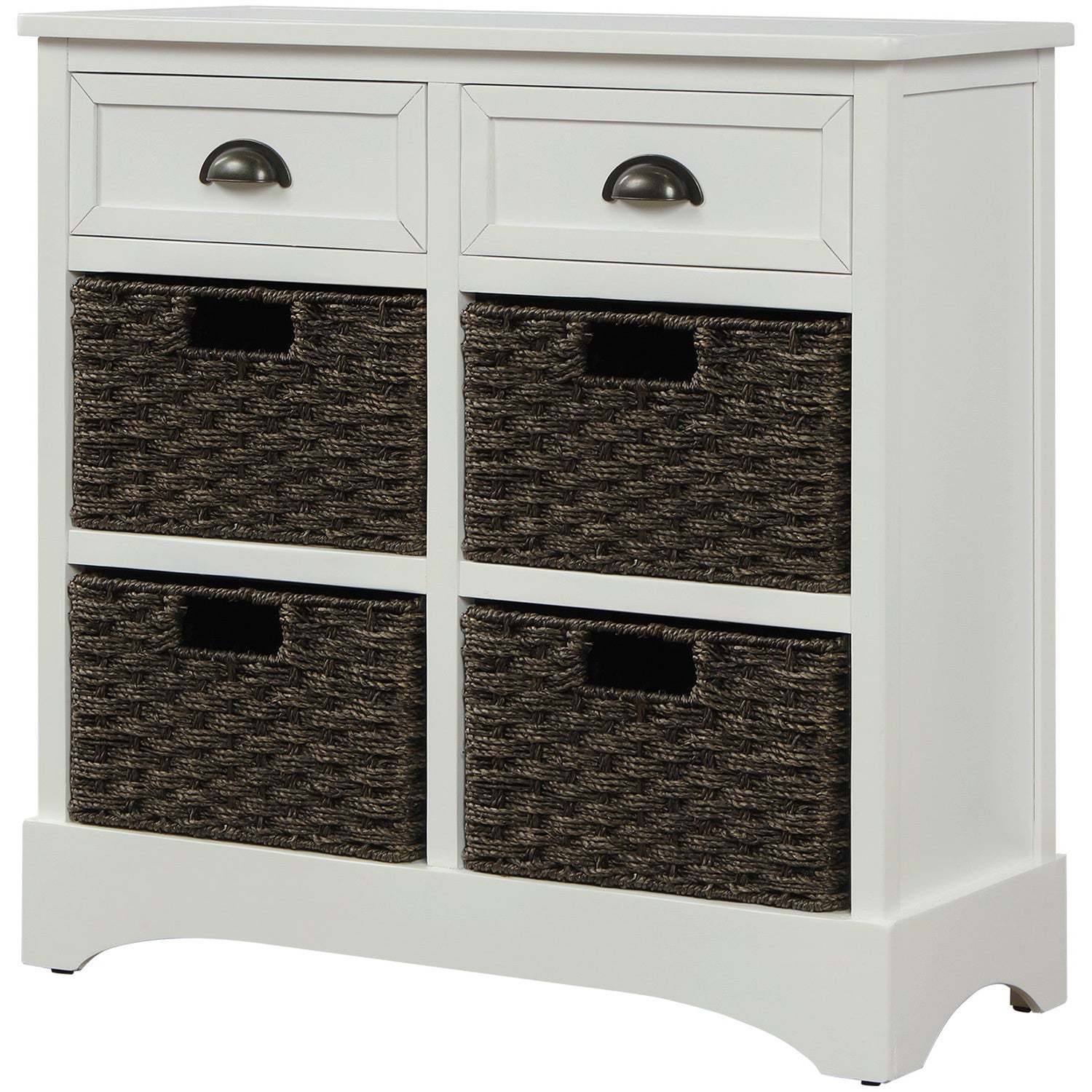 - TREXM White Rustic Storage Cabinet: 2 Drawers, 4 Rattan Baskets