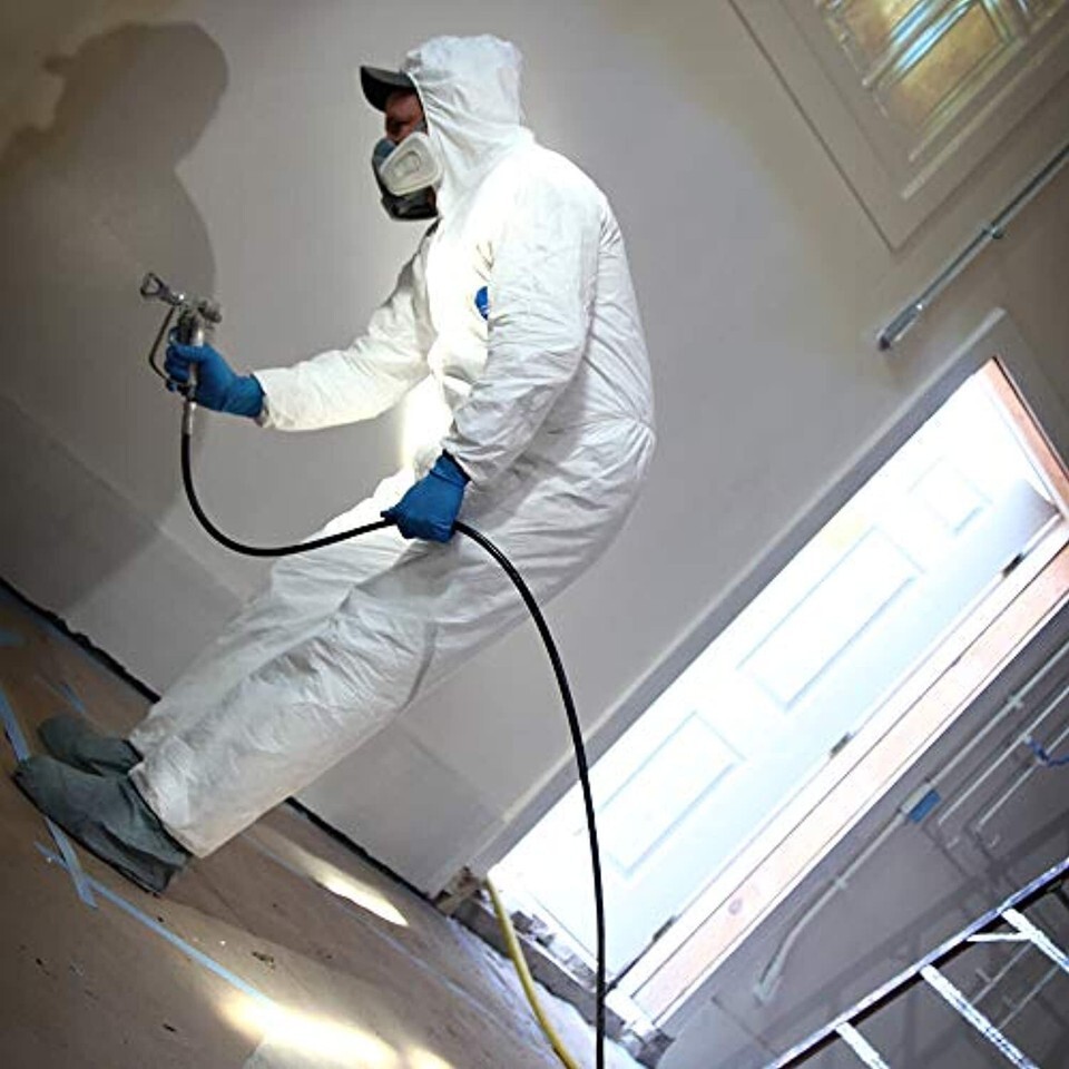 Full coverage Protective coveralls have elastic wrists and ankles, hood, and boots
