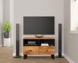 Ample Storage: The cabinet has two roomy drawers and an open shelf to organize your media stuff, books, and decor. The mix of closed and open storage is perfect for a tidy space. Durable Construction: Made from solid acacia wood and a strong powder-coated iron frame, this TV cabinet is built to last. It can handle daily use while looking great. Stylish Design: Featuring an industrial vibe with natural wood tones and matte black accents, it fits into many decor styles, adding a trendy look to your space. Easy Assembly: Comes with a handy manual, making setup a breeze. All parts are included, so you can enjoy your new cabinet in no time. Protective Finish: With a matte coating, it resists scratches and stains. Just give it a dust and a quick wipe to keep it looking fresh. Color: Black Shape: Rectangular Material: Wood Solid Acacia wood Finish: Matte Indoor/Outdoor: Indoor Only Cover Included: No Room: Living Room Mounting Included: No Dimensions: 13.0 x 27.6 x 18.1 in (W x L x H) Leg Height: 3.9 in Weight: 39.51 lbs Swings: No Delivery Contains: TV cabinet Assembly Required: Yes Recommended Number of People for Assembly: 2