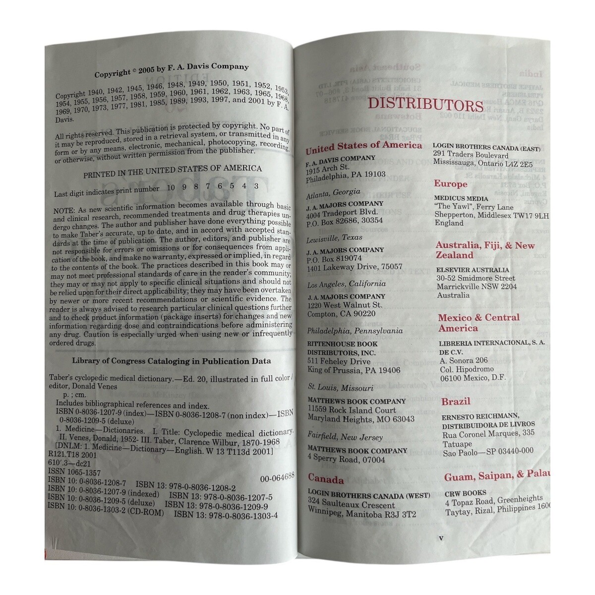 The **20th Edition of Taber?s Cyclopedic Medical Dictionary** by F.A. Davis Company ? a comprehensive medical reference used by healthcare professionals and students worldwide. This thumb-indexed hardcover edition features over **56,000 easy-to-understand definitions**, **700 illustrations** (more than 500 in color), and numerous clinical appendices. Includes expanded terminology and modern medical updates with a focus on nursing, anatomy, and clinical application.