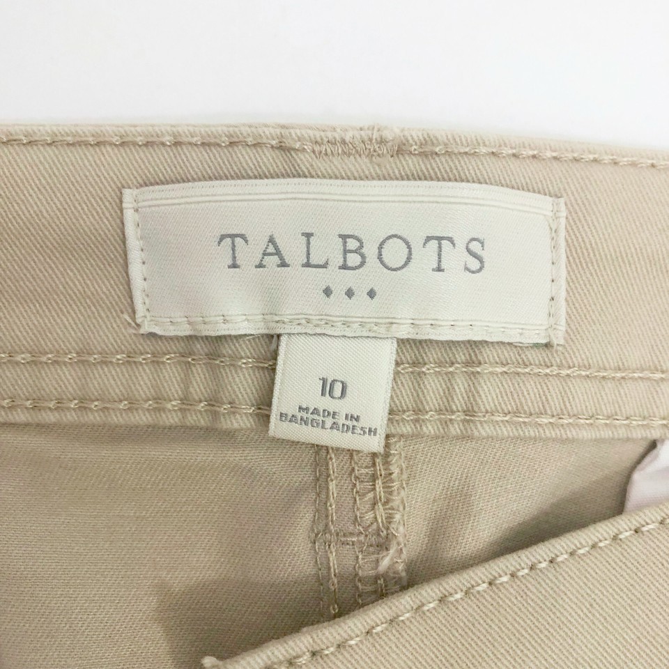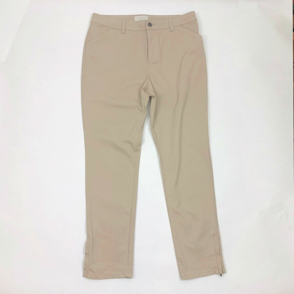 Make Us An Offer EUC, Excellent Used Condition. Talbots pants in a comfortable cotton Spandex blend. There are 4 pockets 2 slit pockets plus you have 2 back hip pockets. The back hip pockets still have the original stitching keeping them closed. Easy to remove. The ankles have zippers on them. No rips, stains or tears. Classic style Beige Khaki color Made in Bangladesh Cotton Spandex blend US size 10 Machine wash cold gentle cycle tumble dry low Waist 16.5 inches Rise 12.5 inches inseam 26.75 inches Knee width 7.5 inches Total length 36 inches Across the hips 19.5 inches Across the ankle 7 inches Please check out the measurements picture SKU BB-1-5-2-036