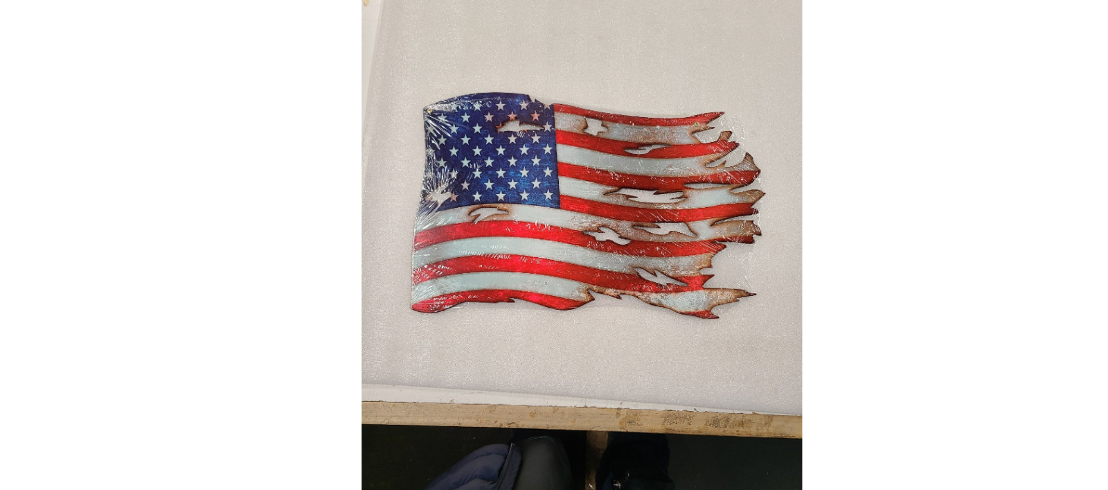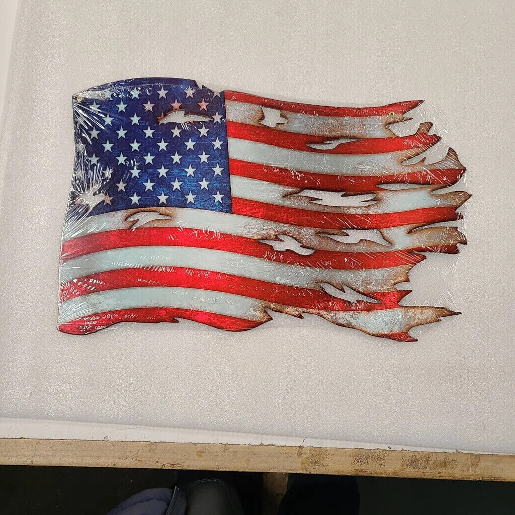 Tattered USA American flag faux vintage steel metal sign this is 18 X 12 inches great for sport bar, den or bedroom kitchen, man cave, kids room, office, school, garage, or hang in house or home, anywhere decor is needed. Great for birthday or Christmas gift.